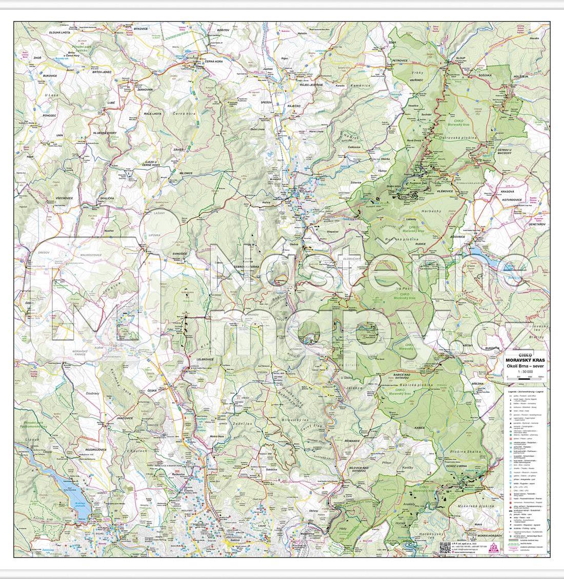 Zeměpisná mapa okolí Brna-sever s vyznačením území CHKO Moravský kras, stínovaným reliéfem a se zakreslenými turistickými i cykloturistickými trasami a zajímavými místy (jeskyně, rozhledny, vyhlídky...).