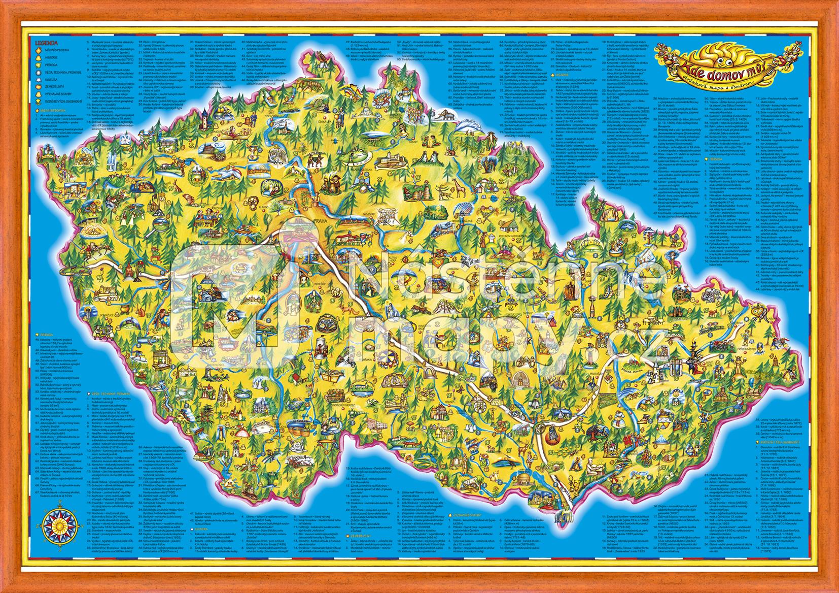 Originální mapa, která zobrazuje specifika jednotlivých oblastí České republiky. Mapa je nakreslená malířkou dětských ilustrací Jitkou Slavíčkovou. Tato mapa zobrazuje zajímavosti z kategorií: historie, příroda, věda, technika a průmysl, kultura, zemědělství , významné stavby, rodiště významných osobností. Jednotlivé zajímavosti jsou v rámci kategrorie číslovány a dále uvedeny v rejstříku, který je zobrazen okolo mapy. Mapa je určena pro děti všech věkových kategorií. Předškolní děti se seznámi s tím, jak naše republika vypadá, kde jsou jaké hory a řeky či žijí zvířata. Starší děti už ocení velkou řadu podrobnějších informací. V neposlední řadě poslouží mapa jako inspirace pro rodiče, kam s dětmi zajet na výlet nebo naopak jako připomínka navštívených míst.