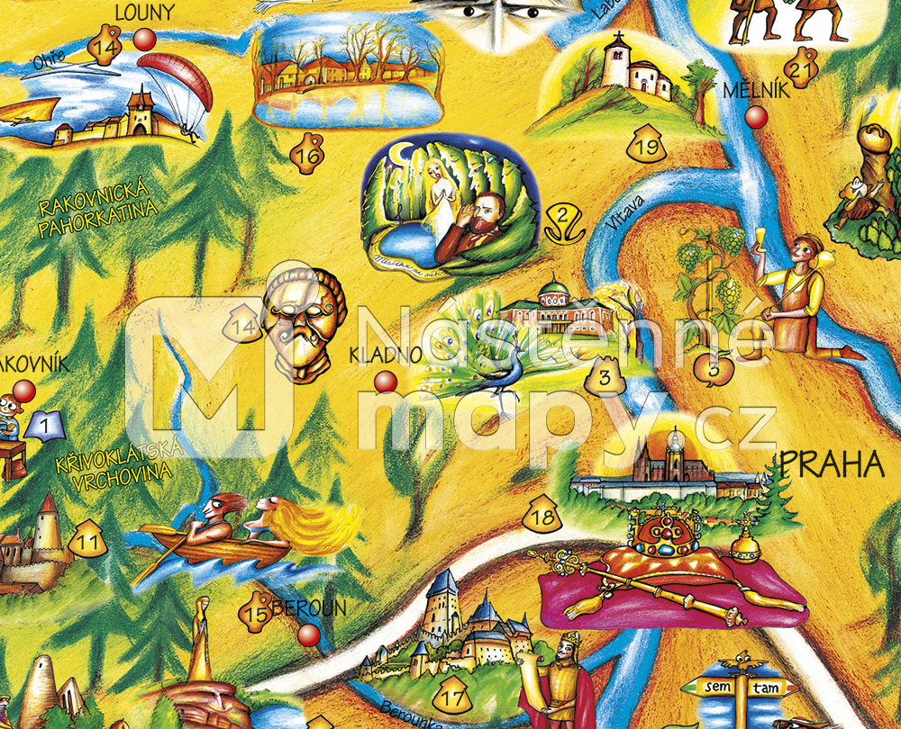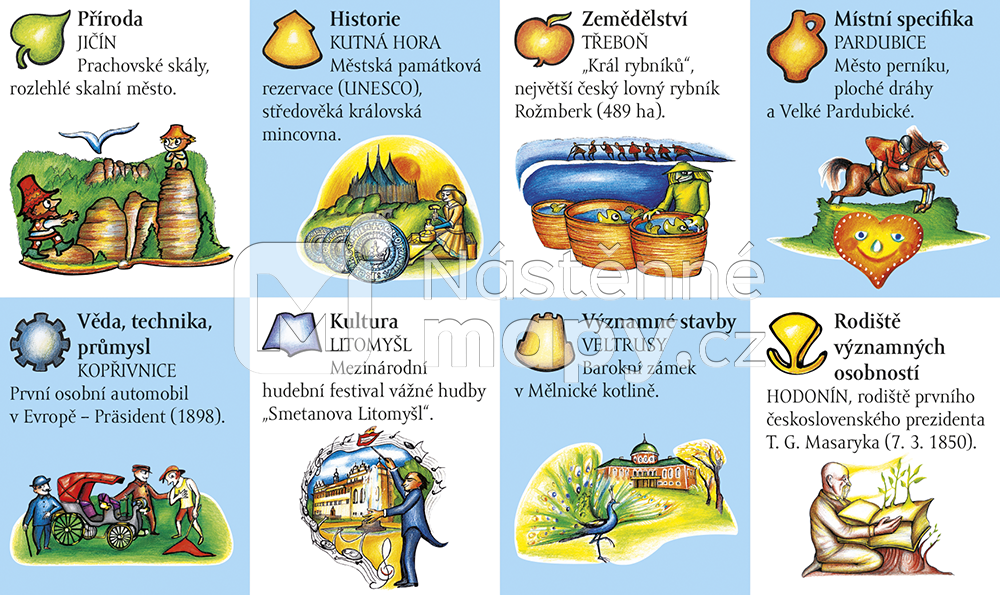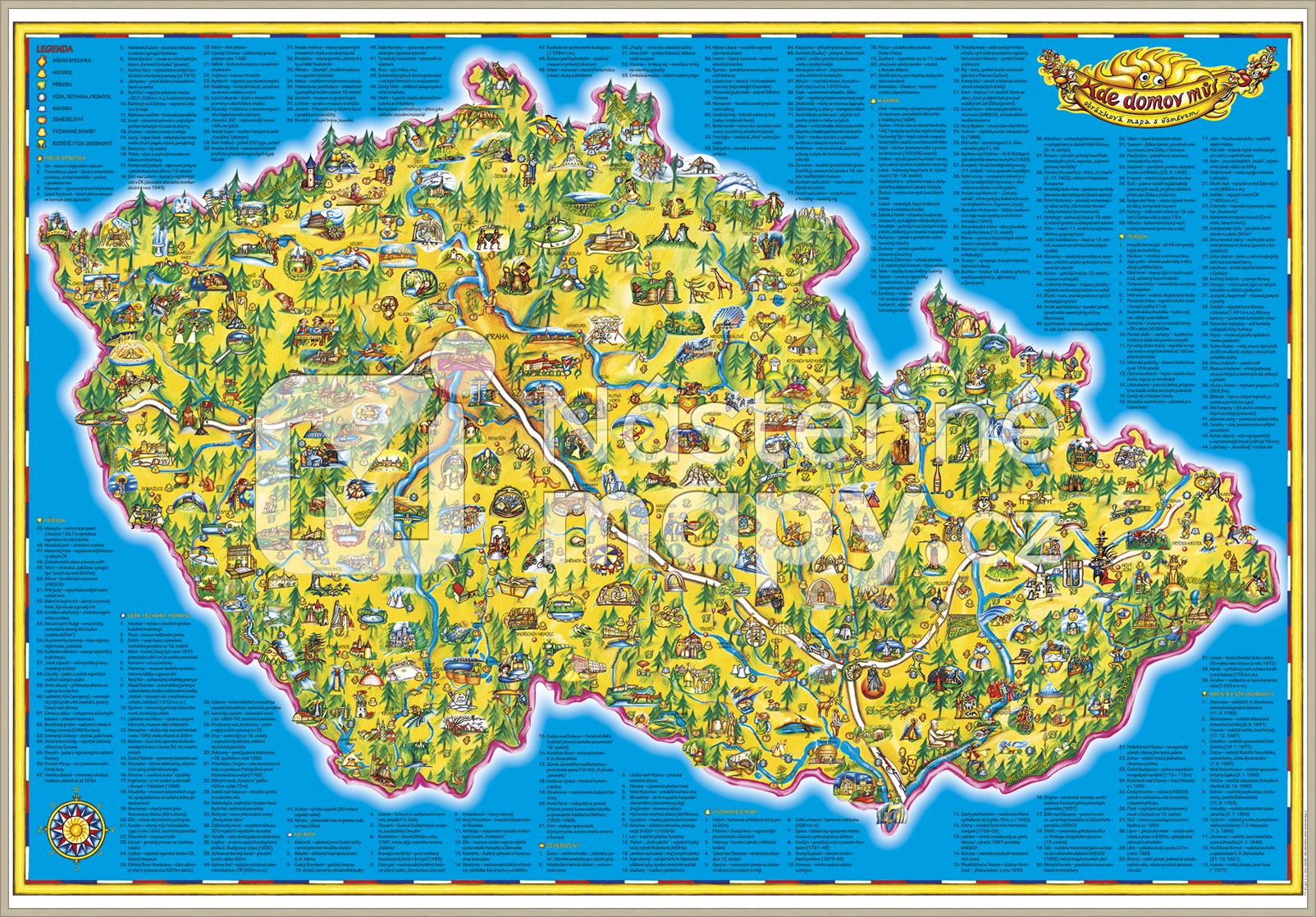 Originální mapa, která zobrazuje specifika jednotlivých oblastí České republiky. Mapa je nakreslená malířkou dětských ilustrací Jitkou Slavíčkovou. Tato mapa zobrazuje zajímavosti z kategorií: historie, příroda, věda, technika a průmysl, kultura, zemědělství , významné stavby, rodiště významných osobností. Jednotlivé zajímavosti jsou v rámci kategrorie číslovány a dále uvedeny v rejstříku, který je zobrazen okolo mapy. Mapa je určena pro děti všech věkových kategorií. Předškolní děti se seznámi s tím, jak naše republika vypadá, kde jsou jaké hory a řeky či žijí zvířata. Starší děti už ocení velkou řadu podrobnějších informací. V neposlední řadě poslouží mapa jako inspirace pro rodiče, kam s dětmi zajet na výlet nebo naopak jako připomínka navštívených míst.