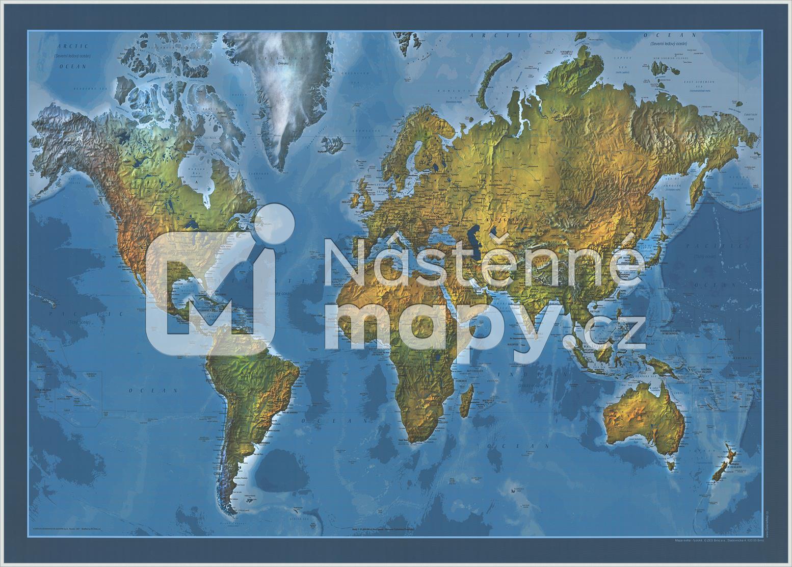 Tato obecně zeměpisná mapa světa již na první pohled upoutá svým působivě zpracovaným stínovaným reliéfem, díky jemuž vypadá opravdu plasticky. Mapa využívá standardní barevnost horstev a nížin, zobrazuje hranice států, městská sídla, řeky, jezera a moře. Lze využít ve školách při výuce zeměpisu i jako působivou dekorativní grafiku ve firemních prostorách.