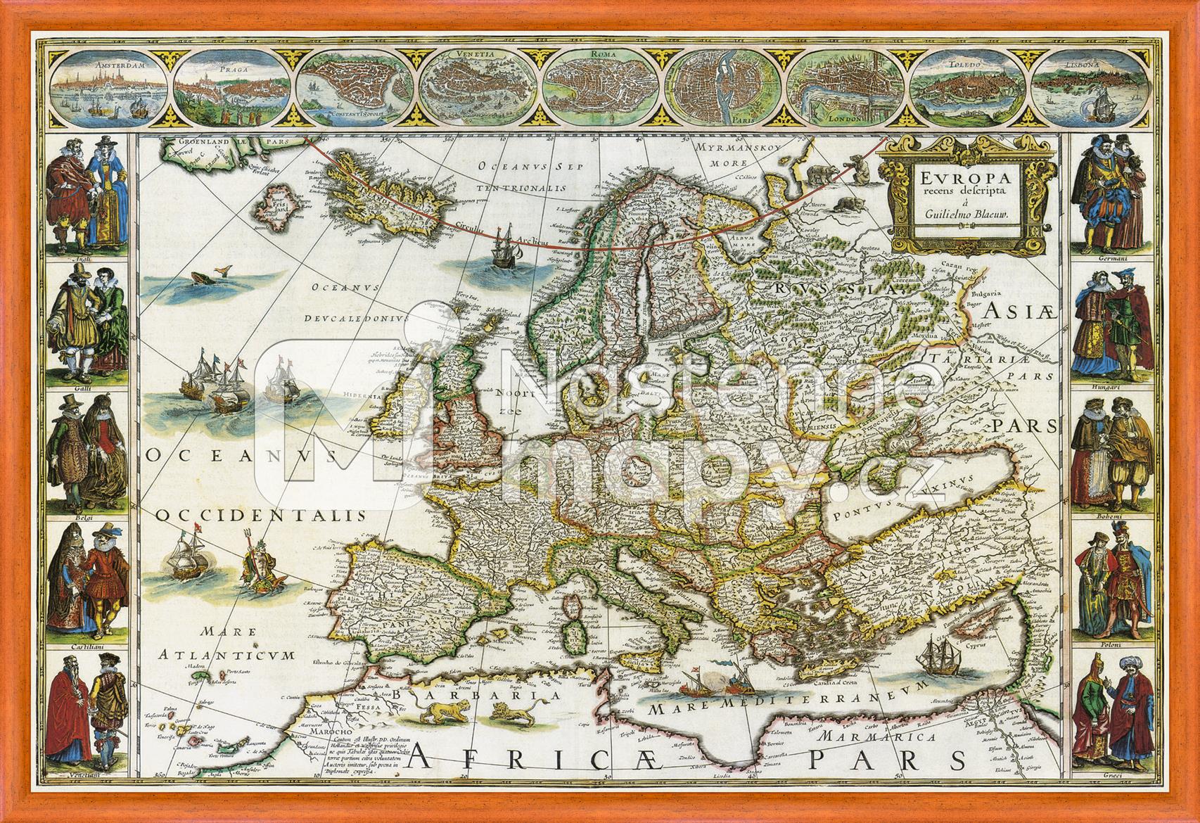 Historická kolorovaná mapa Evropy pochází z Blaeuovy dílny. Tato bohatě zdobená rytina s četnými vedutami evropských měst zobrazuje starý kontinent na konci sedmnáctého století. Po stranách mapy jsou vyobrazeny páry z evropských zemí v dobových šatech. Pořiďte si tuto mapu a získáte decentní a zároveň poutavou dekoraci do Vašeho interiéru! Laminované a rámované mapy jsou opatřeny matným laminem. Upozornění – na tyto mapy není vhodné používat popisovací fixy, dochází k poškození matného povrchu lamina.