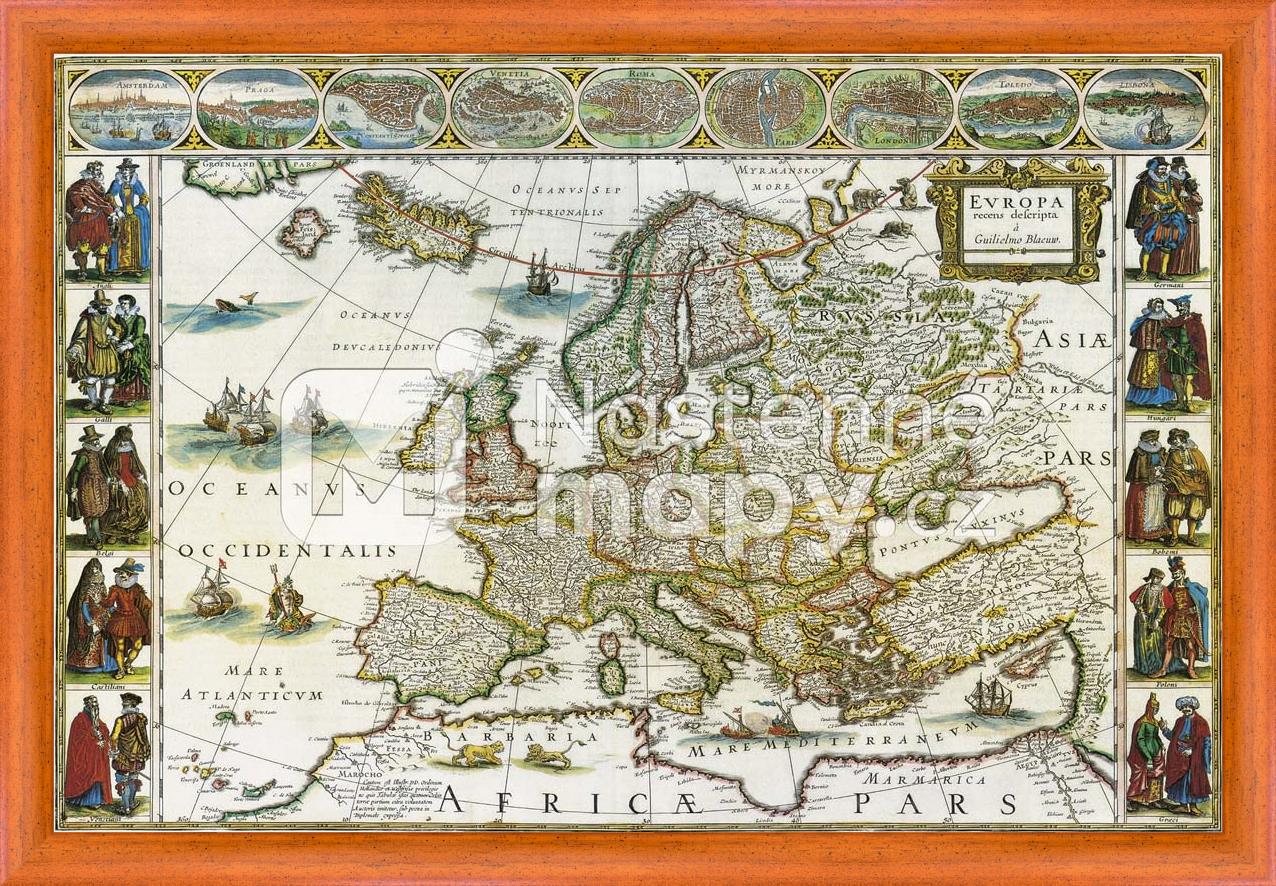 Historická kolorovaná mapa Evropy pochází z Blaeuovy dílny. Tato bohatě zdobená rytina s četnými vedutami evropských měst zobrazuje starý kontinent na konci sedmnáctého století. Po stranách mapy jsou vyobrazeny páry z evropských zemí v dobových šatech. Pořiďte si tuto mapu a získáte decentní a zároveň poutavou dekoraci do Vašeho interiéru! Laminované a rámované mapy jsou opatřeny matným laminem. Upozornění – na tyto mapy není vhodné používat popisovací fixy, dochází k poškození matného povrchu lamina.