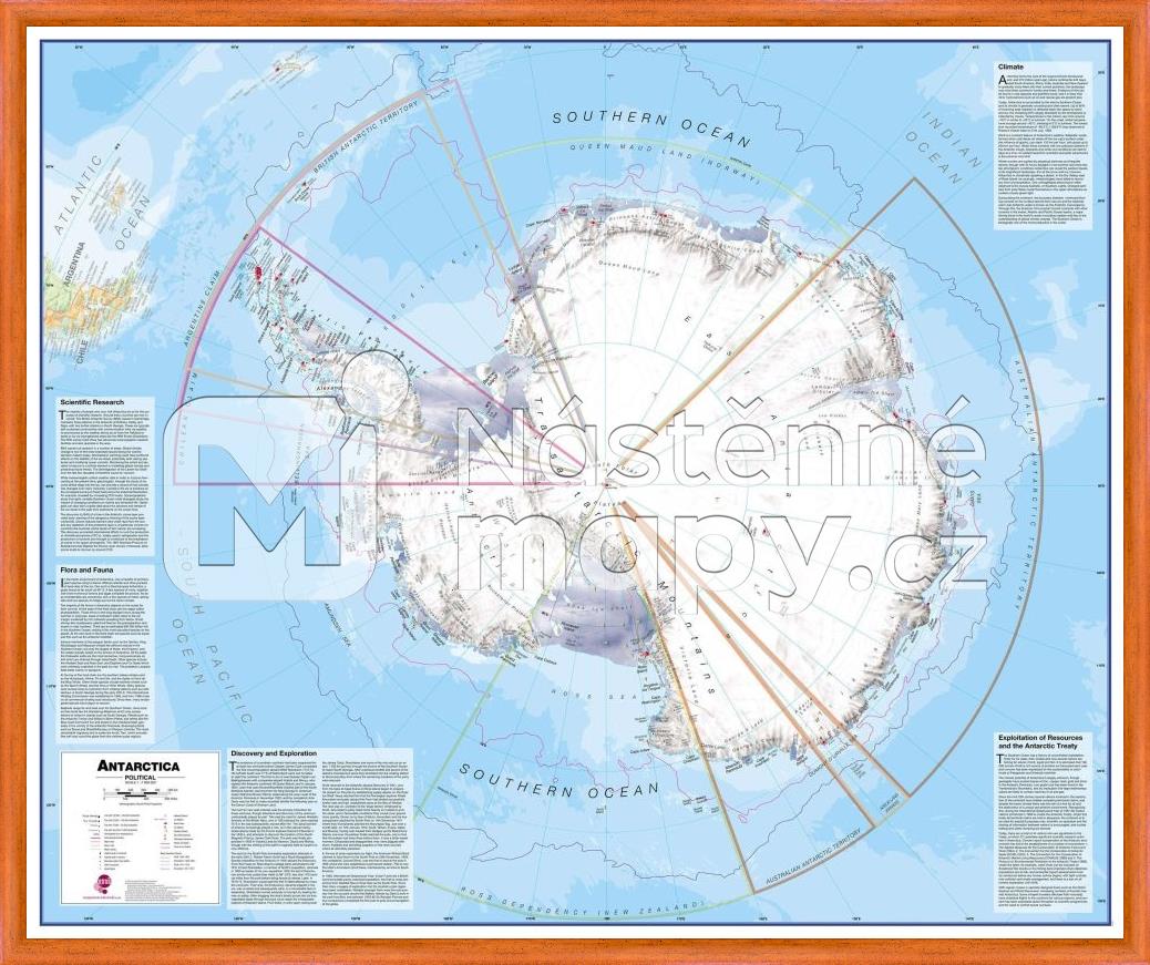 Velká politická mapa Antarktidy s podrobnými údaji o klimatu, fauně a flóře, objevech a jiných zajímavostech poskytnutých institutem British Antarctic Survey. Na mapě jsou zobrazena území, která si nárokují některé státy; jsou vyznačeny hlavní železnice, hlavní a vedlejší silnice, polární stanice, meteorologické stanice, základní tábory, letiště, ale také zimní a letní rozsah ledu.