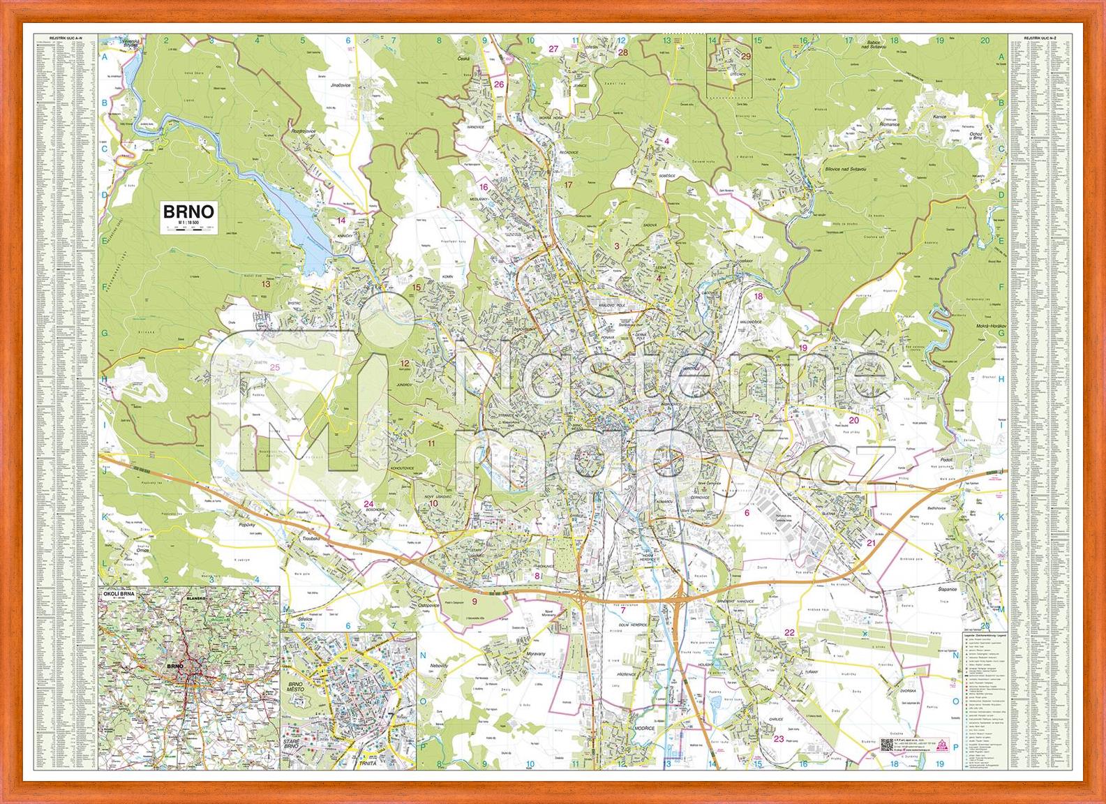 Nástěnný plán města Brna v měřítku 1 :  18 500 s rejstříkem ulic přímo na mapě. Součástí je také mapa okolí Brna v měřítku 1 :  200 000.