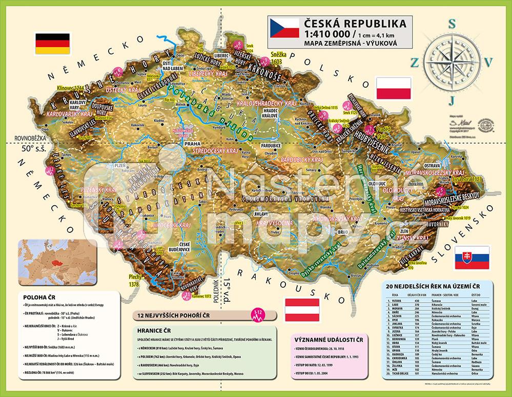 Oboustranná nástěnná mapa České republiky je vhodná pro snazší získání znalostí z vlastivědy a zeměpisu. Na mapě jsou přehledně zakresleny řeky, jezera, nádrže, pohoří, vrcholy, nížiny, hranice krajů, krajská a okresní města, sousední státy, rovnoběžka a poledník. Na rubové straně napy lze ověřit zeměpisné znalosti pomocí slepé mapy. Mapa je z obou stran opatřena laminem, které prodlužuje její životnost a chrání proti vlhkosti a mechanickému poškození.