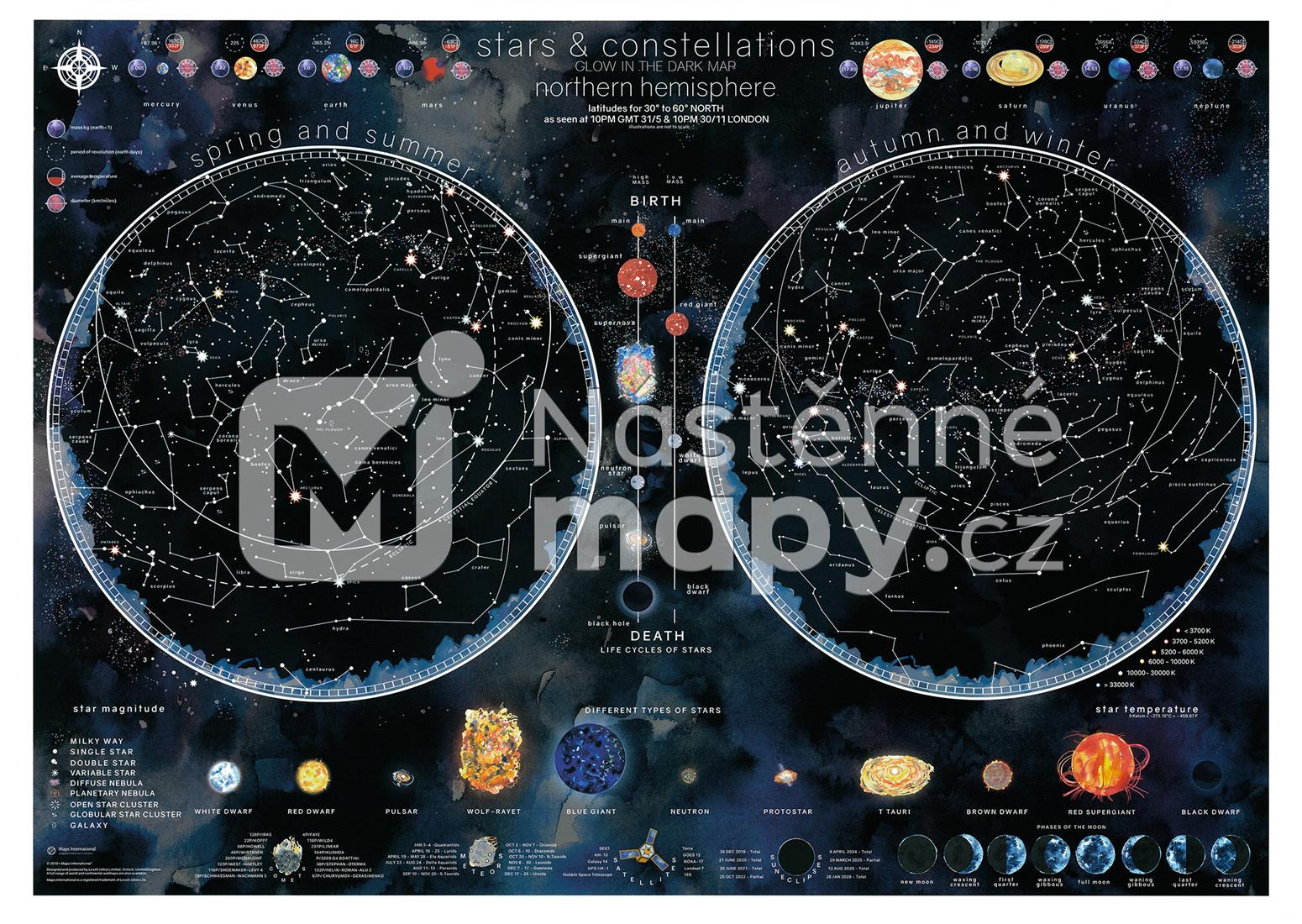 Zajímá Vás, která souhvězdí můžete na noční obloze vidět na jaře a v létě a která na podzim a v zimě? Tato překrásná mapa hvězd a souhvězdí je určena pro všechny obdivovatele vesmíru, kteří si chtějí hvězdnou oblohu připomínat ve svém pokoji ve dne i v noci. Díky fosforeskující vrstvě se hvězdy na mapě po setmění rozzáří stejně jako na nebi.