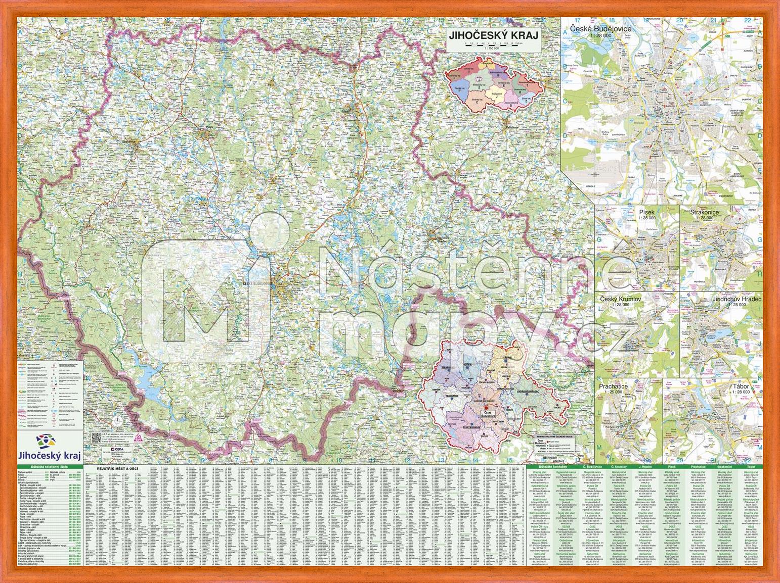 Mapa Jihočeského kraje v měřítku 1 : 150 000, doplněná plány měst České Budějovice, Český Krumlov, Jindřichův Hradec, Písek, Prachatice, Strakonice a Tábor. Součástí mapy je rejstřík obcí. Mapa je opatřena laminem, které prodlužuje její životnost a chrání ji proti vlhkosti a poškození. Lze popisovat stíratelným fixem.