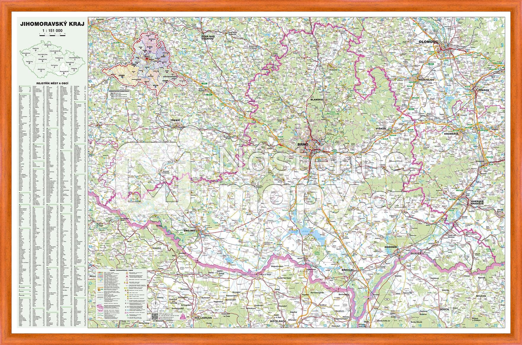 Podrobná mapa Jihomoravského kraje s kompletní silniční sítí, obcemi, vodními plochami, s vyznačením hranic okresů. Doplněna o rejstřík obcí. Mapa je opatřena laminem, které prodlužuje její životnost a chrání ji proti vlhkosti a poškození. Lze popisovat stíratelným fixem.
