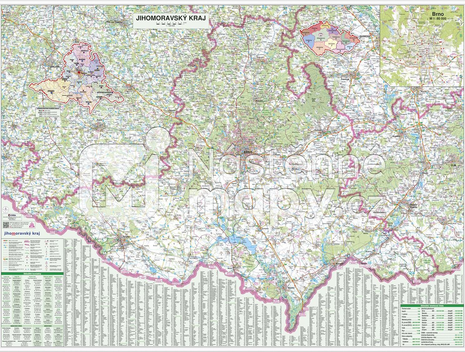 Mapa Jihomoravského kraje v měřítku 1 : 130 000, doplněná průjezdním plánem Brna. Součástí mapy je rejstřík obcí. Mapa je opatřena laminem, které prodlužuje její životnost a chrání ji proti vlhkosti a poškození. Lze popisovat stíratelným fixem.