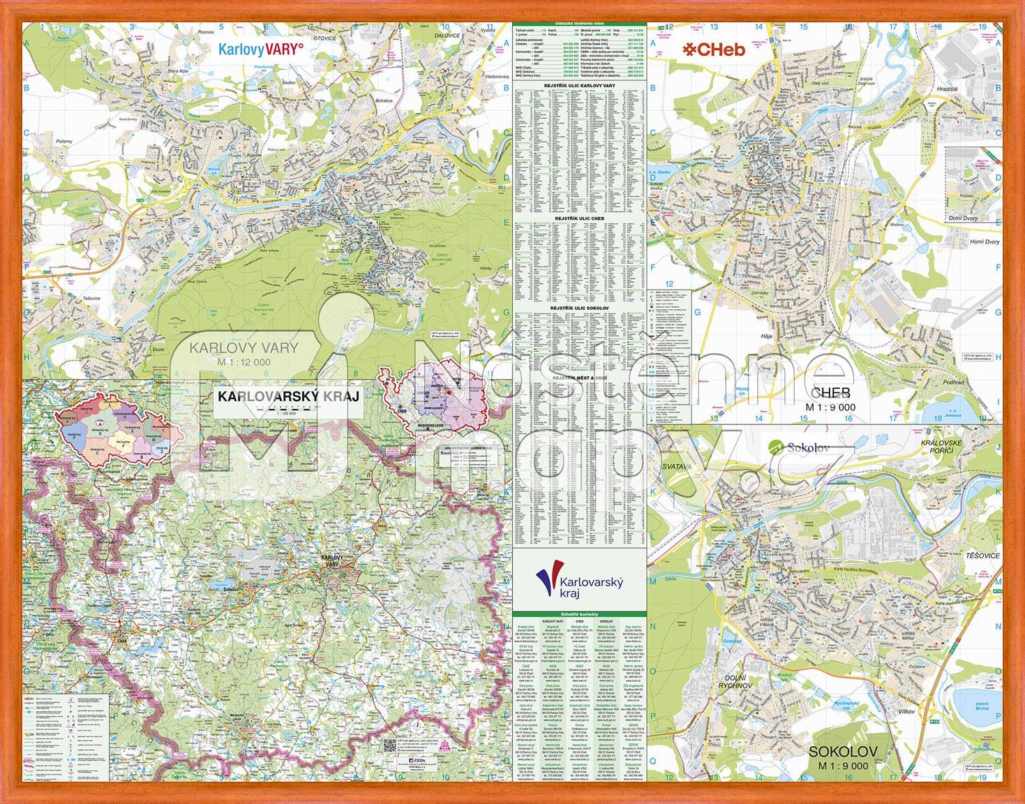 Mapa Karlovarského kraje v měřítku 1 : 130 000, doplněná průjezdními plány měst Karlovy Vary, Cheb a Sokolov. Součástí mapy je rejstřík obcí. Mapa je opatřena laminem, které prodlužuje její životnost a chrání ji proti vlhkosti a poškození. Lze popisovat stíratelným fixem.