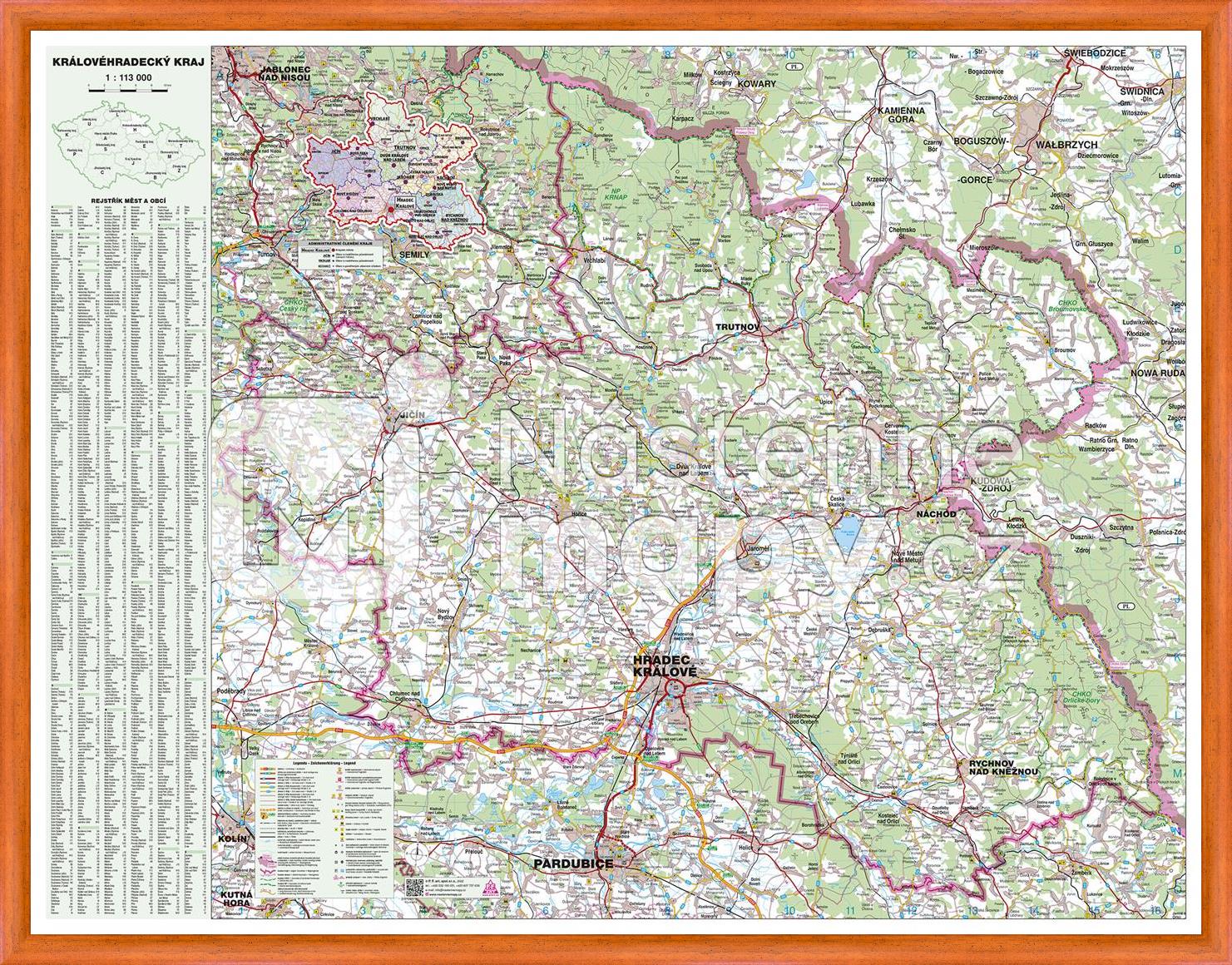 Podrobná mapa Královéhradeckého kraje s kompletní silniční sítí, obcemi, vodními plochami, s vyznačením hranic okresů. Doplněna o restřík obcí Královéhradeckého kraje. Mapa je opatřena laminem, které prodlužuje její životnost a chrání ji proti vlhkosti a poškození. Lze popisovat stíratelným fixem.