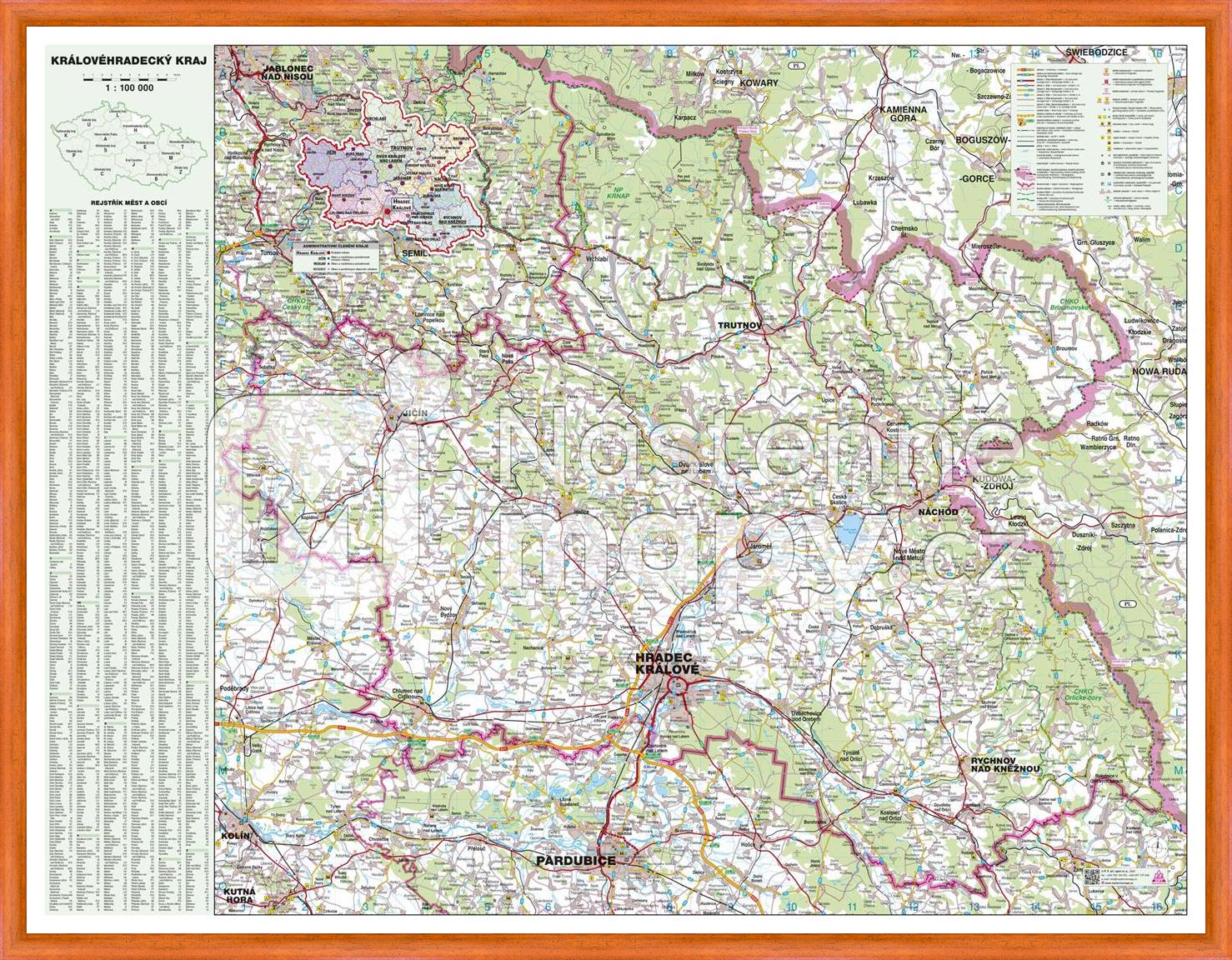 Podrobná mapa Královéhradeckého kraje s kompletní silniční sítí, obcemi, vodními plochami, s vyznačením hranic okresů. Doplněna o rejstřík obcí. Mapa je opatřena laminem, které prodlužuje její životnost a chrání ji proti vlhkosti a poškození. Lze popisovat stíratelným fixem.