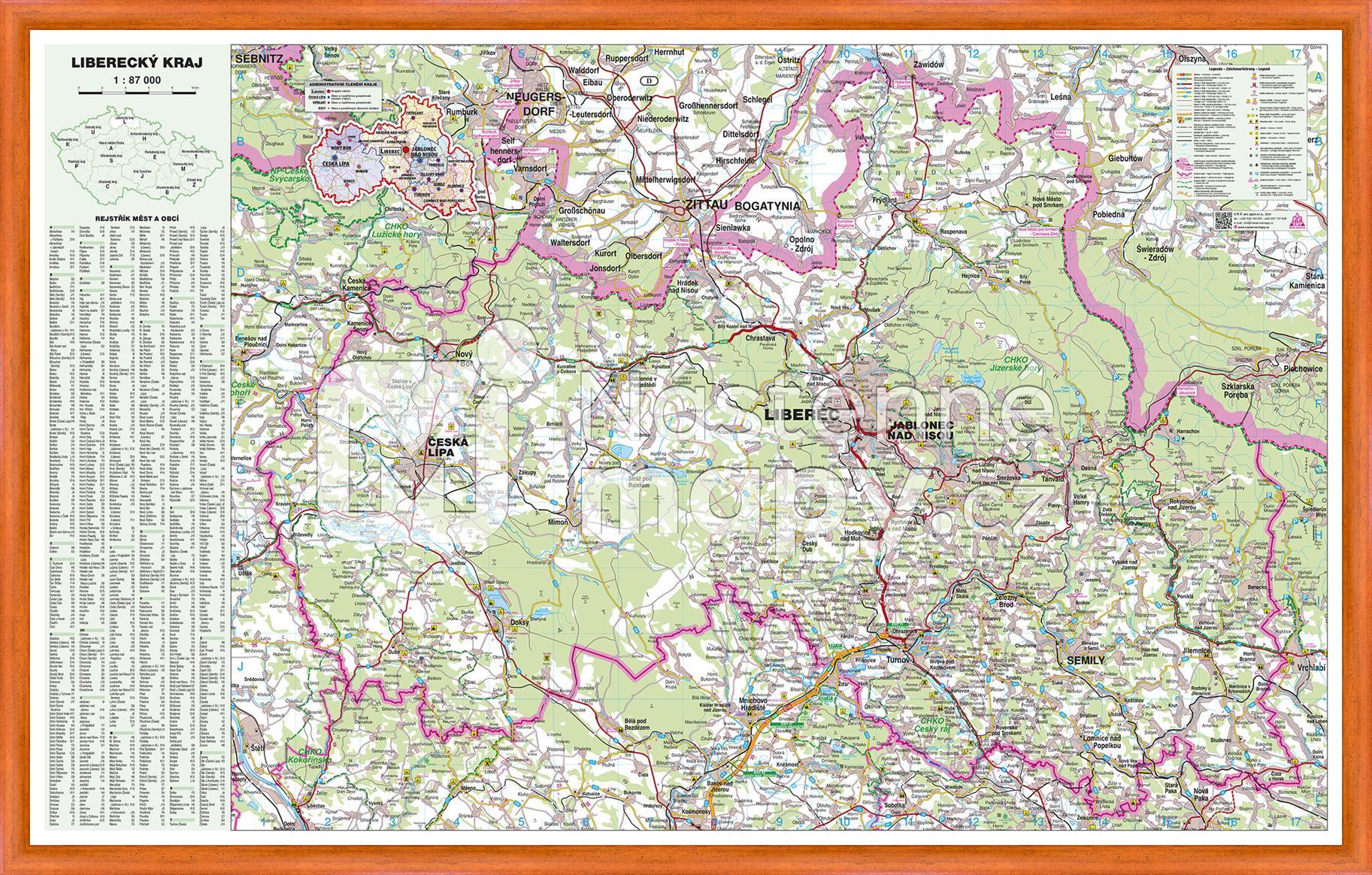 Podrobná mapa Libereckého kraje s kompletní silniční sítí, obcemi, vodními plochami, s vyznačením hranic okresů. Doplněna o rejstřík obcí. Mapa je opatřena laminem, které prodlužuje její životnost a chrání ji proti vlhkosti a poškození. Lze popisovat stíratelným fixem.