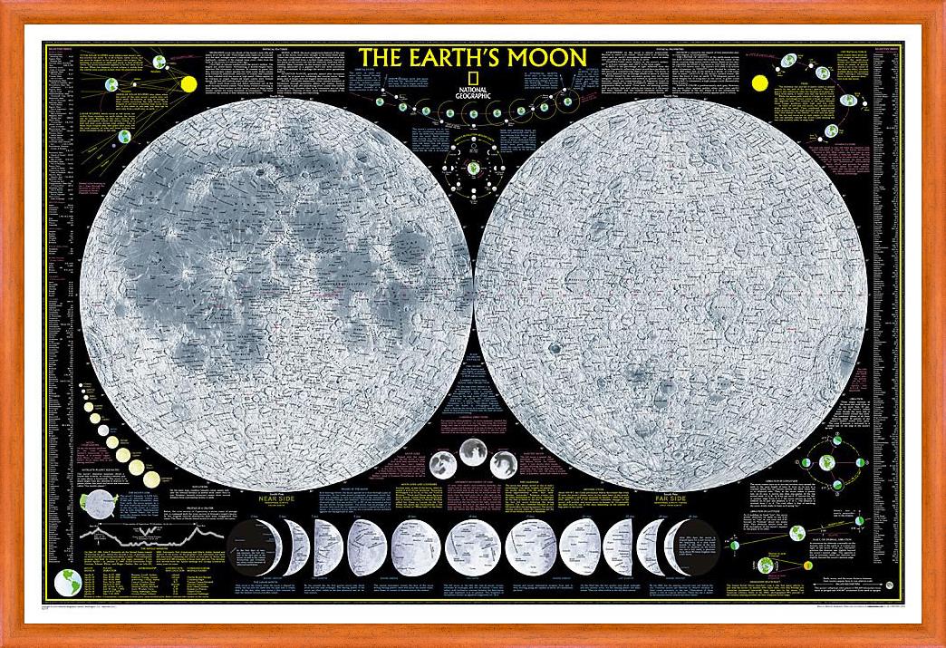 Tato neuvěřitelně informativní nástěnná mapa obsahuje detailní zobrazení celého povrchu Měsíce se selektivním indexem, který ukazuje pojmenované fyzické rysy. Diagramy ukazují oběžnou dráhu Měsíce, rotaci kolem Země, librace, jak dochází k zatmění Slunce a Měsíce a jak Měsíc ovlivňuje zemský příliv a odliv. Podrobně jsou popsány a zobrazeny fáze Měsíce při pohledu ze Země. Nechybí ani krátery, pohoří, hornatiny, moře a další povrchové jevy. Obsahuje také srovnání s měsíci jiných planet v naší sluneční soustavě a informace o misích Apollo. Mapa je atraktivní i poučná pro každého, kdo se zajímá o astronomii.