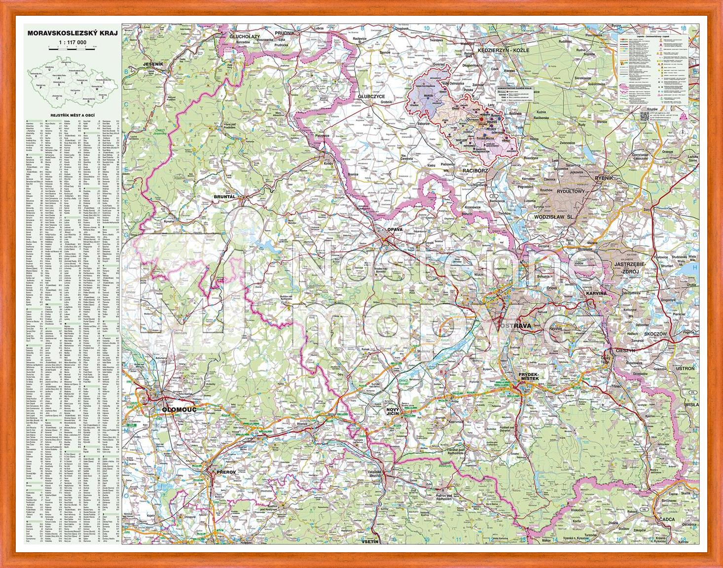 Podrobná mapa Moravskoslezského kraje s kompletní silniční sítí, obcemi, vodními plochami, s vyznačením hranic okresů. Doplněna o rejstřík obcí. Mapa je opatřena laminem, které prodlužuje její životnost a chrání ji proti vlhkosti a poškození. Lze popisovat stíratelným fixem.