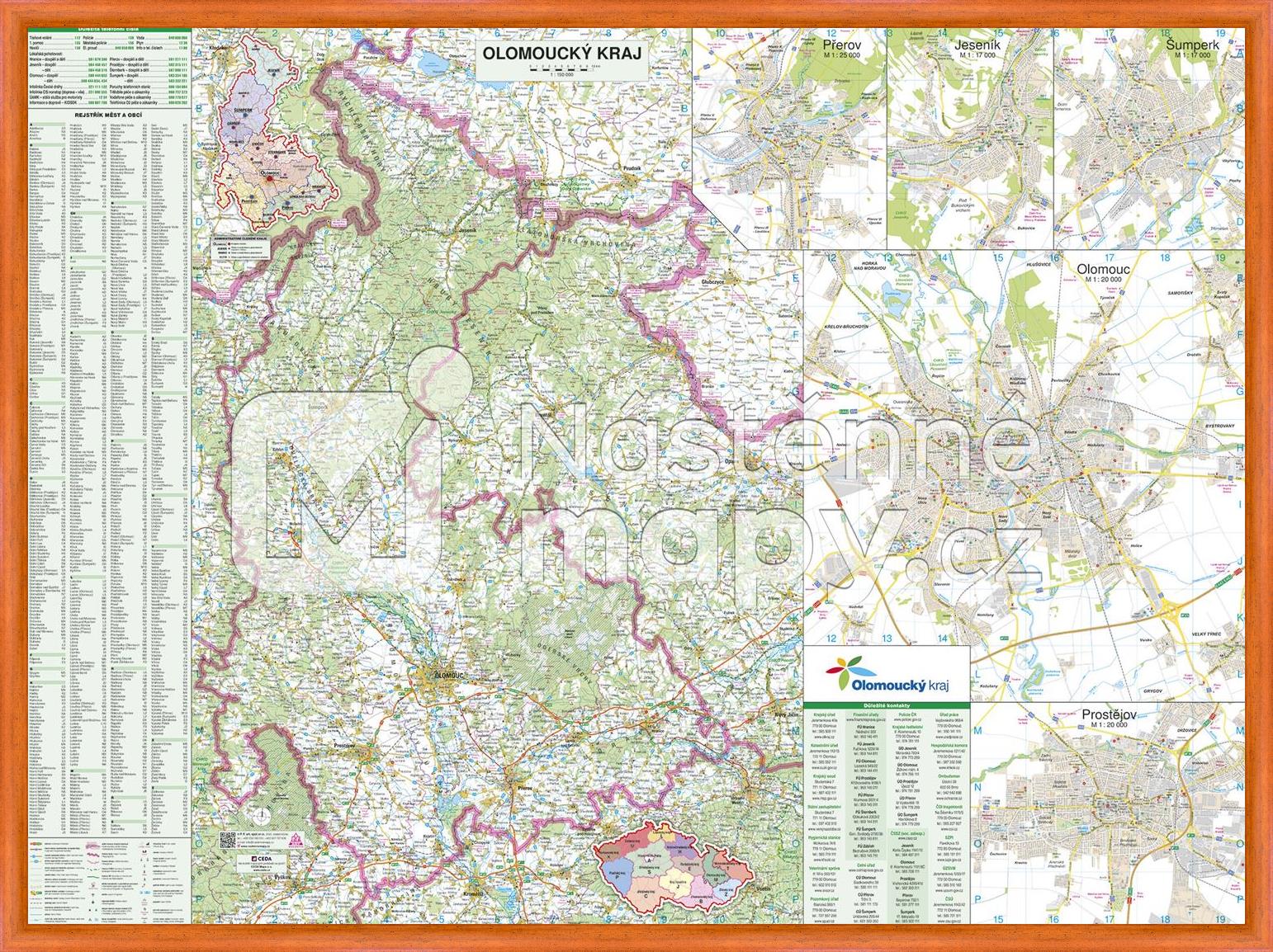 Mapa Olomouckého kraje v měřítku 1 : 150 000, doplněná průjezdními plány měst Olomouc, Prostějov, Šumperk, Jeseník a Přerov. Součástí mapy je rejstřík obcí. Mapa je opatřena laminem, které prodlužuje její životnost a chrání ji proti vlhkosti a poškození. Lze popisovat stíratelným fixem.