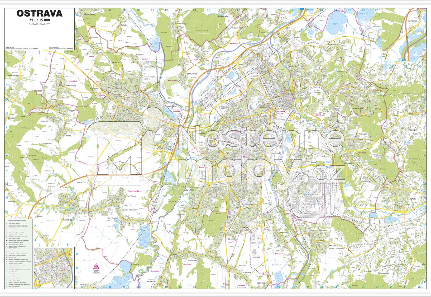 Nástěnný plán města Ostravy v měřítku 1 : 17 500 s rejstříkem ulic přímo na mapě. Součástí je také mapa okolí Ostravy.