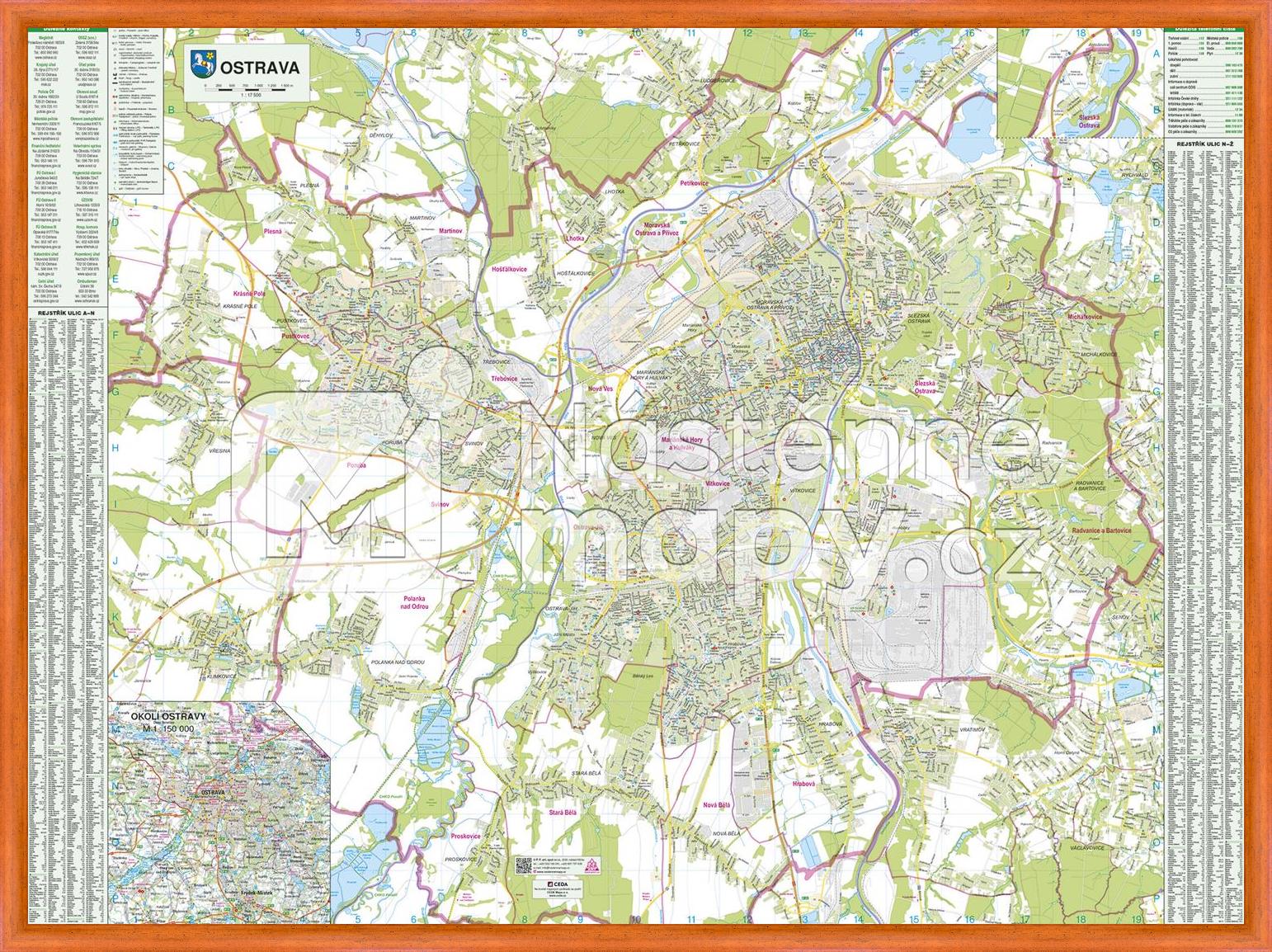 Nástěnný plán města Ostravy v měřítku 1 : 17 500 s rejstříkem ulic přímo na mapě. Součástí je také mapa okolí Ostravy.