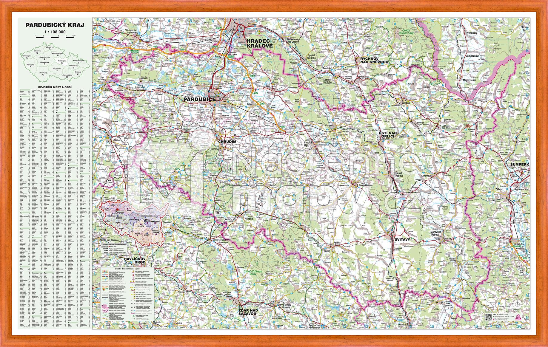 Podrobná mapa Pardubického kraje s kompletní silniční sítí, obcemi, vodními plochami, s vyznačením hranic okresů. Doplněna o restřík obcí Pardubického kraje. Mapa je opatřena laminem, které prodlužuje její životnost a chrání ji proti vlhkosti a poškození. Lze popisovat stíratelným fixem.