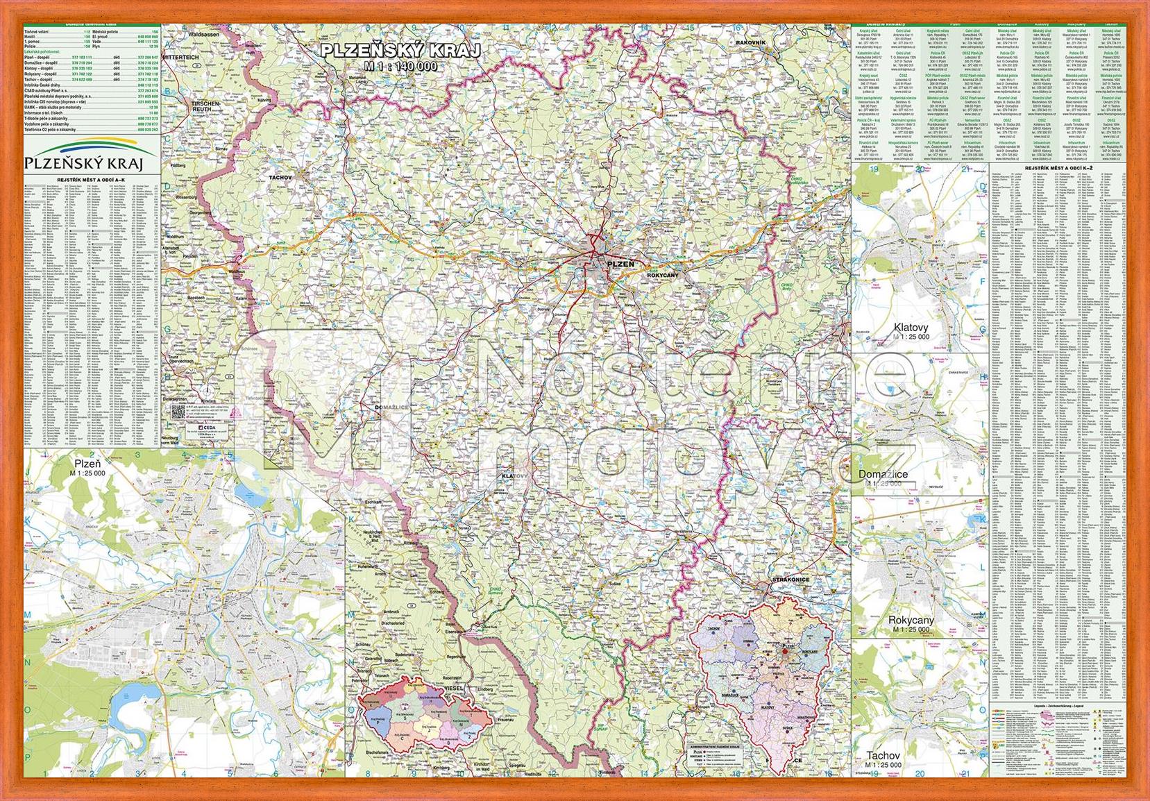 Mapa Plzeňského kraje v měřítku 1 : 140 000, doplněná průjezdními plány měst Domažlice, Klatovy, Plzeň, Rokycany a Tachov. Součástí mapy je rejstřík obcí. Mapa je opatřena laminem, které prodlužuje její životnost a chrání ji proti vlhkosti a poškození. Lze popisovat stíratelným fixem.