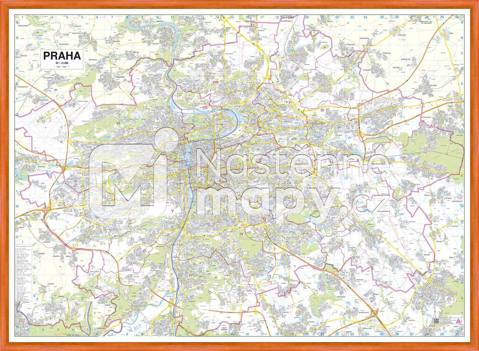 Velká nástěnná mapa Prahy v měřítku 1 : 21 000 s mapou okolí, formát 153 x 111 cm. Rejstřík ulic ke stažení zde.