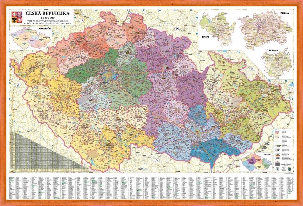Mapa České republiky s barevným rozlišením jednotlivých regionů podle PSČ a kompletní silniční sítí vč. komunikací 3. třídy. Na mapě je rejstřík obcí (nad 1000 obyvatel) a kilometrovník mezi 70 největšími městy ČR.