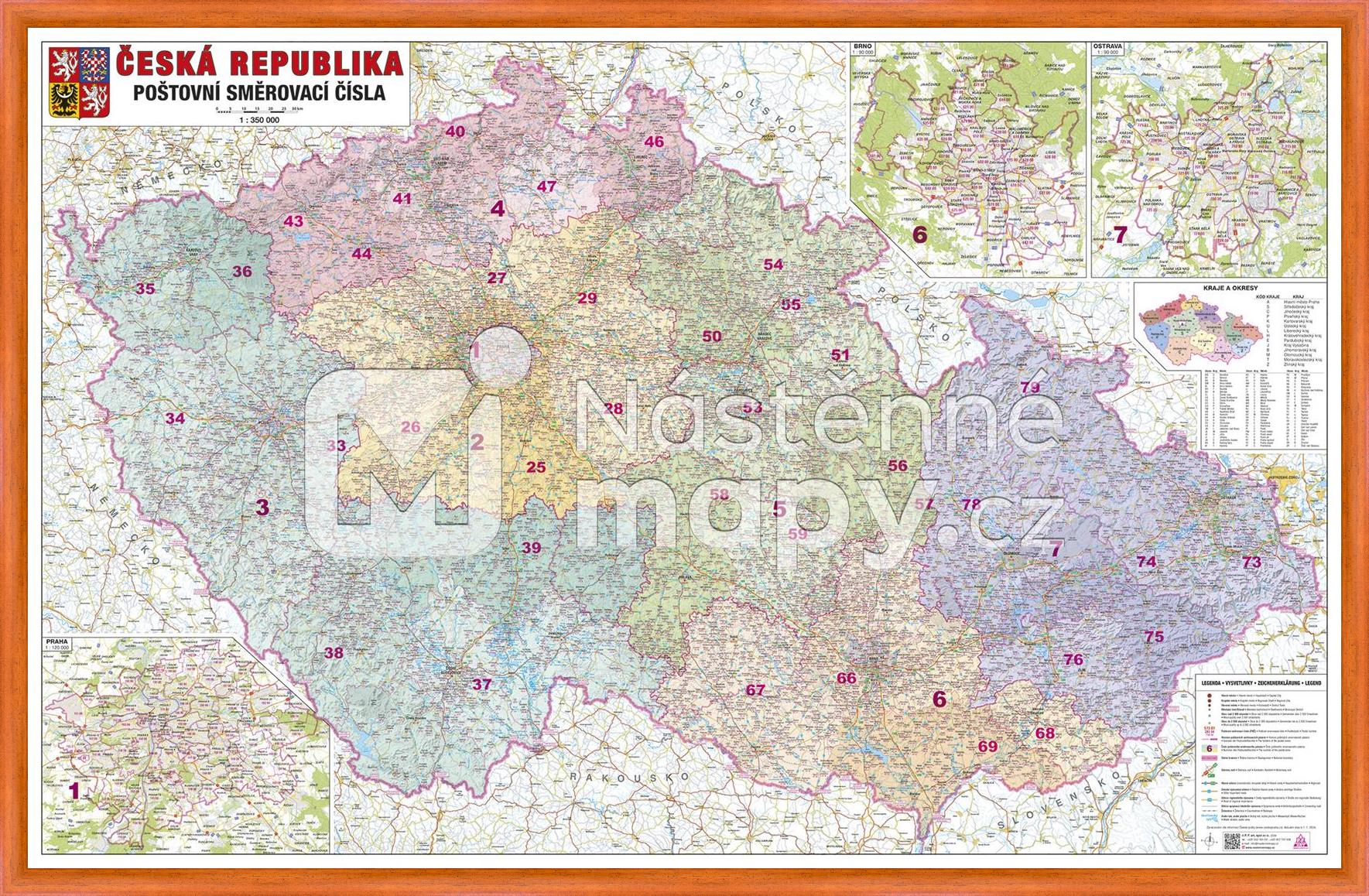 Mapa České republiky se zaznačením poštovních směrových čísel obcí i městských obvodů ČR. Mapa je zpracována v měřítku 1 : 350 000.