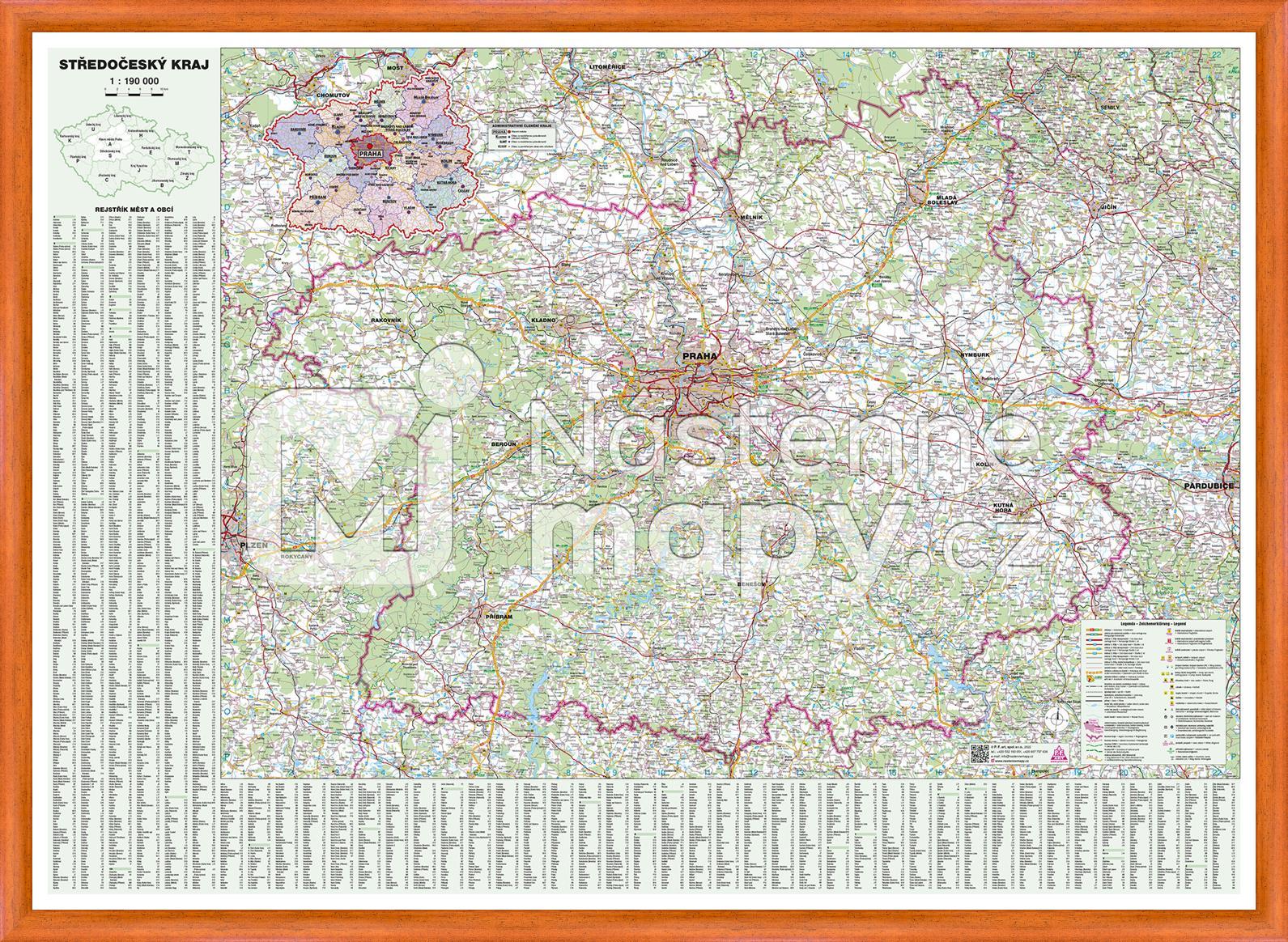 Podrobná mapa Středočeského kraje s kompletní silniční sítí, obcemi, vodními plochami, s vyznačením hranic okresů. Doplněna o restřík obcí Středočeského kraje. Mapa je opatřena laminem, které prodlužuje její životnost a chrání ji proti vlhkosti a poškození. Lze popisovat stíratelným fixem.