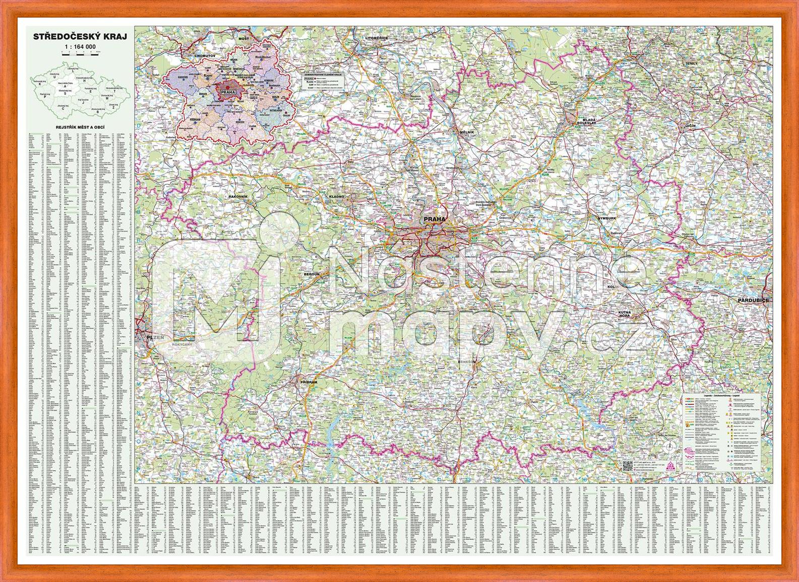Podrobná mapa Středočeského kraje s kompletní silniční sítí, obcemi, vodními plochami, s vyznačením hranic okresů. Doplněna o rejstřík obcí. Mapa je opatřena laminem, které prodlužuje její životnost a chrání ji proti vlhkosti a poškození. Lze popisovat stíratelným fixem.