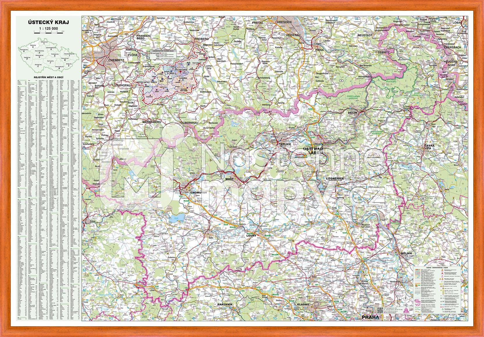Podrobná mapa Ústeckého kraje s kompletní silniční sítí, obcemi, vodními plochami, s vyznačením hranic okresů. Doplněna o rejstřík obcí. Mapa je opatřena laminem, které prodlužuje její životnost a chrání ji proti vlhkosti a poškození. Lze popisovat stíratelným fixem.