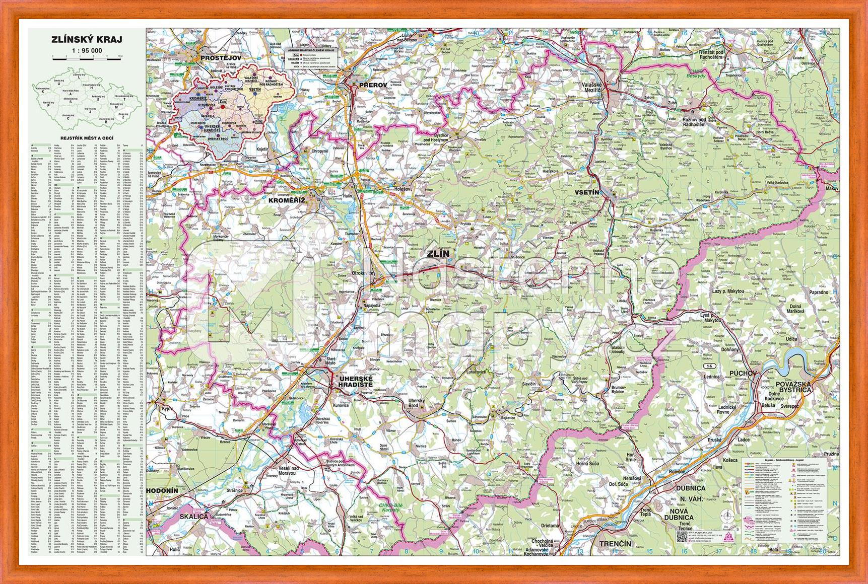 Podrobná mapa Zlínského kraje s kompletní silniční sítí, obcemi, vodními plochami, s vyznačením hranic okresů. Doplněna o rejstřík obcí. Mapa je opatřena laminem, které prodlužuje její životnost a chrání ji proti vlhkosti a poškození. Lze popisovat stíratelným fixem.