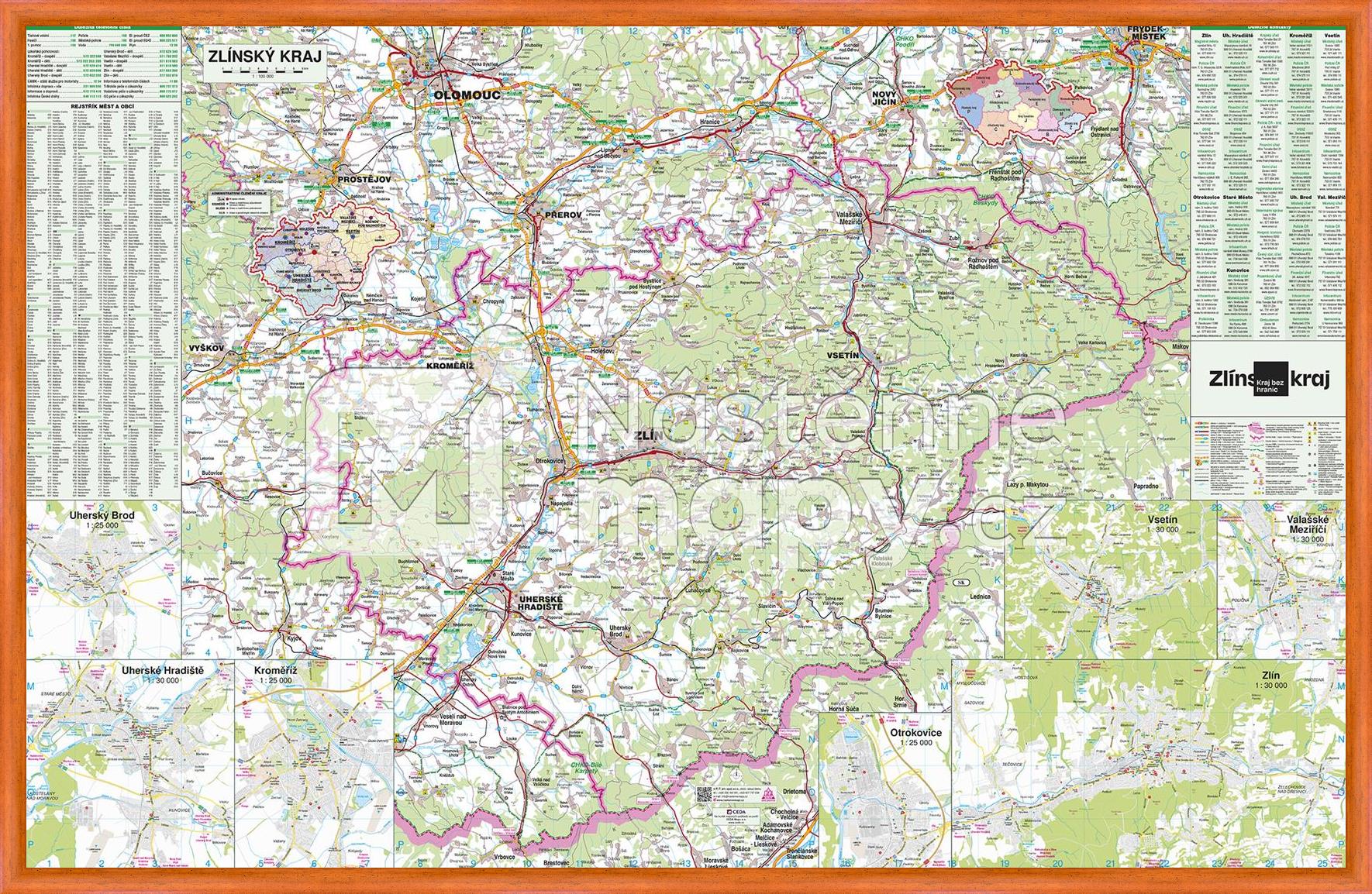 Mapa Zlínského kraje v měřítku 1 : 100 000, doplněná průjezdními plány měst Kroměříž, Otrokovice, Uherské Hradiště, Uherský Brod, Valašské Meziříčí, Vsetín a Zlín. Součástí mapy je rejstřík obcí. Mapa je opatřena laminem, které prodlužuje její životnost a chrání ji proti vlhkosti a poškození. Lze popisovat stíratelným fixem.
