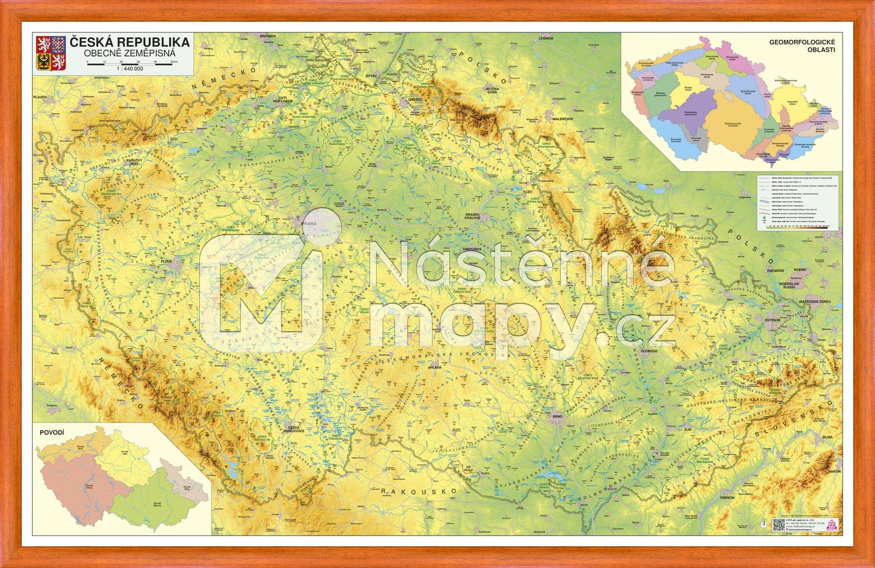 Pořízením rámované mapy získáte působivou interiérovou dekoraci. Do rámu je mapa zasazena laminovaná a kašírovaná - celoplošně strojově lepená na lehčené, přitom pevné desce. Zvolit můžete rám ze standardní nabídky. V případě požadavku na jinou barevnou variantu Vám rádi vyjdeme vstříc, aktuální nabídka rámů se průběžně mění.