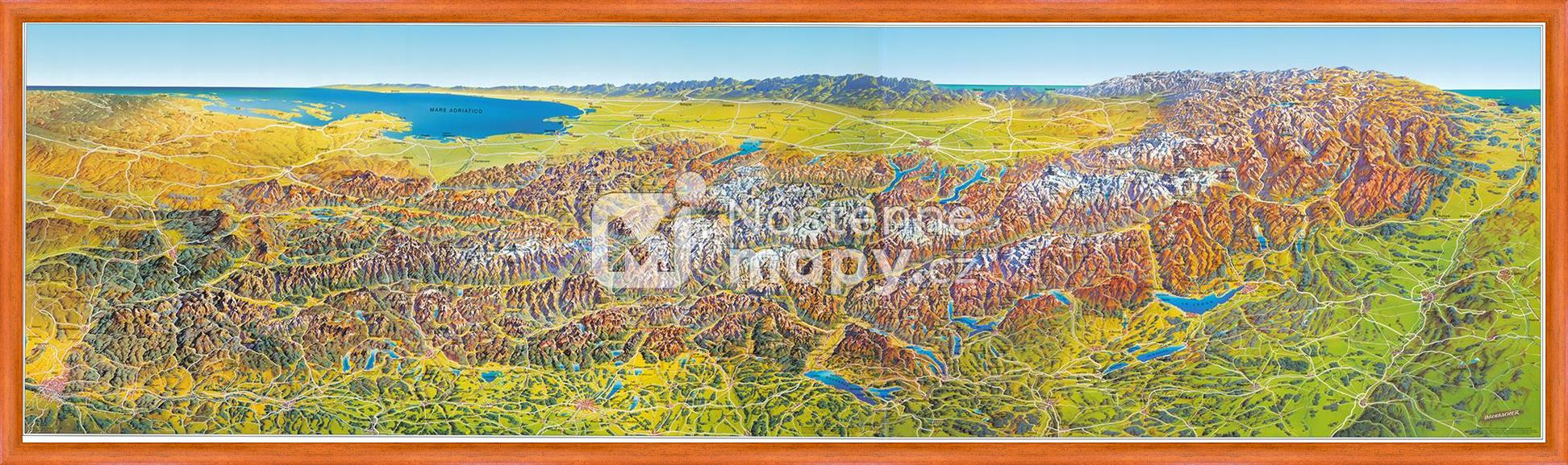 Jezdíte rádi do Alp? Lyžovat, jezdit na kole nebo za horskými túrami? Pořiďte si panoramatickou mapu tohoto atraktivního pohoří a těšte se na další výpravy při pohledu na tuto působivou mapu Alp. Pohoří je nakresleno ze severní strany a zachycuje oblast od Vídně až po Provence.