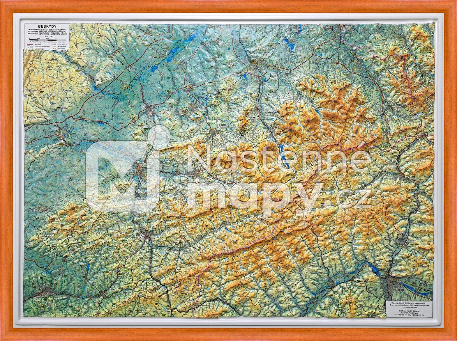 Mapa zachycuje Moravskoslezské Beskydy, Slezské Beskydy, Vsetínské Beskydy, Hostýnské vrchy, Javorníky, Veřovické a Vizovické vrchy. Obsahuje turistické značení, cyklotrasy, hranice ochrany přírody, rozhledny a jiné zajímavosti. Obecně zeměpisná mapa s turistickým značením a především s efektním plastickým reliéfem pohoří se představuje v novém zpracování za využití digitálního modelu terénu. Použitím speciálních barev je zajištěna odolnost potisku vůči otěru.
