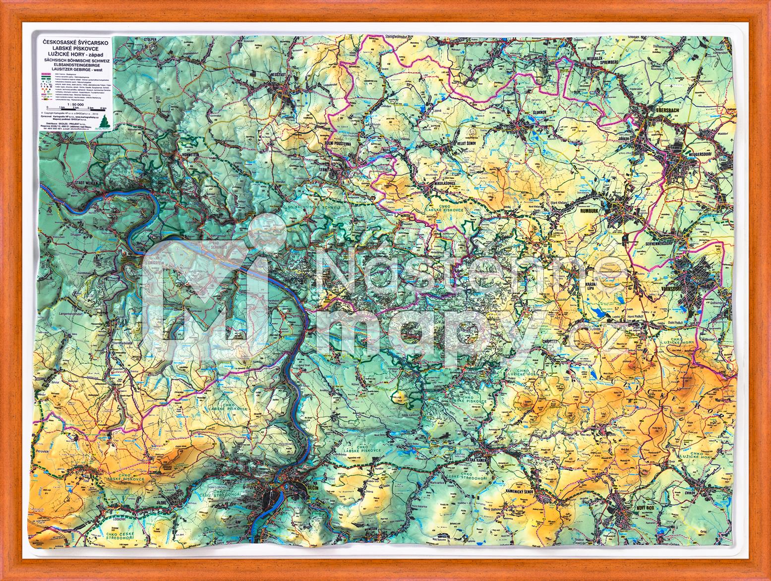 Plastická 3D mapa zobrazuje NP Českosaské Švýcarsko, Lužické hory a oblast Labských pískovců. Obecně zeměpisná mapa s turistickým značením a především s efektním plastickým reliéfem pohoří se představuje v novém zpracování za využití digitálního modelu terénu. Použitím speciálních barev je zajištěna odolnost potisku vůči otěru.
