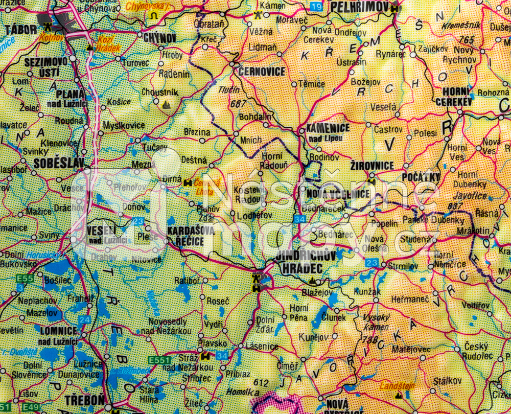 Plastické zpracování klasické zeměpisné mapy ČR s potiskem odolným vůči otěru.