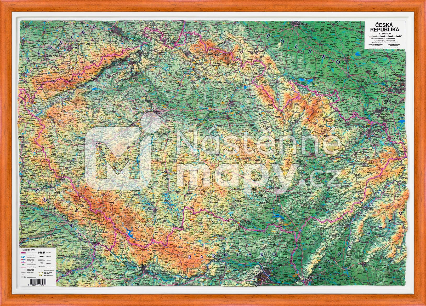 Plastické zpracování klasické zeměpisné mapy ČR s potiskem odolným vůči otěru.