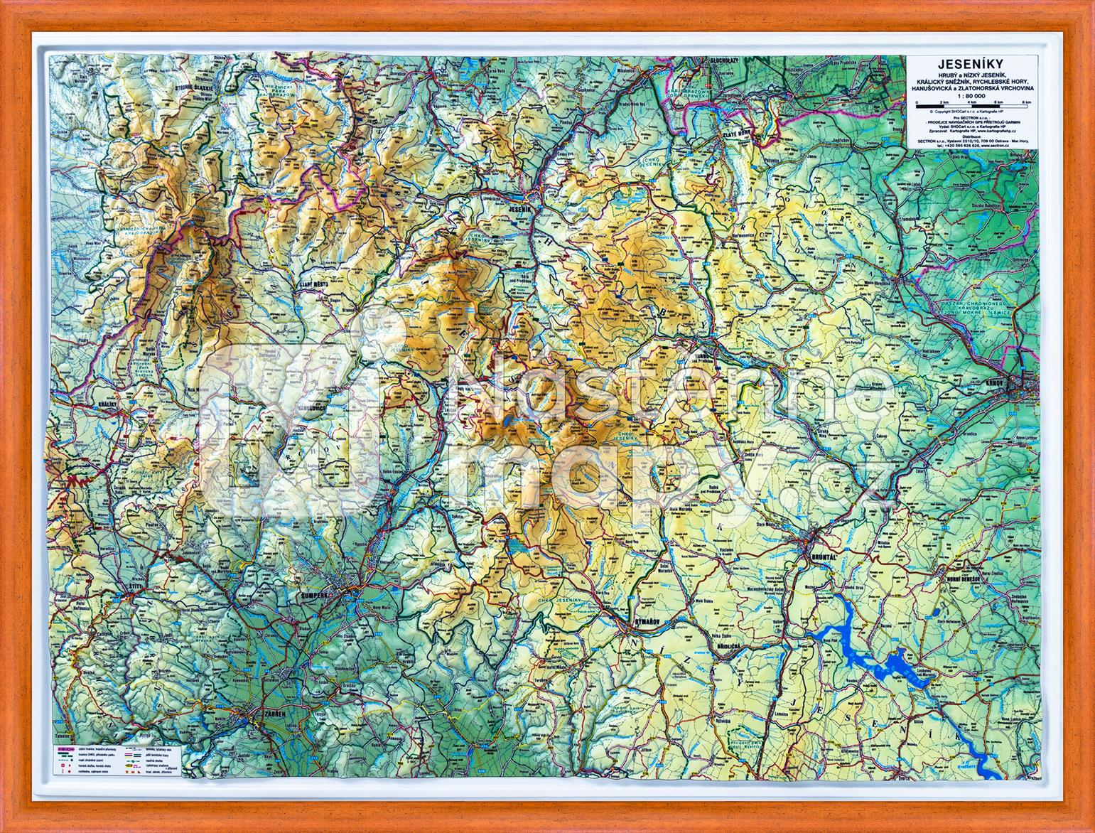 Mapa obsahuje Hrubý a Nízký Jeseník, Králický Sněžník, Rychlebské hory, Hanušovickou a Zlatohorskou vrchovinu; v mapovém podkladu jsou vyznačeny stezky pro pěší a cyklotrasy, turistické zajímavosti atd. Obecně zeměpisná mapa s turistickým značením a především s efektním plastickým reliéfem pohoří se představuje v novém zpracování za využití digitálního modelu terénu. Použitím speciálních barev je zajištěna odolnost potisku vůči otěru.
