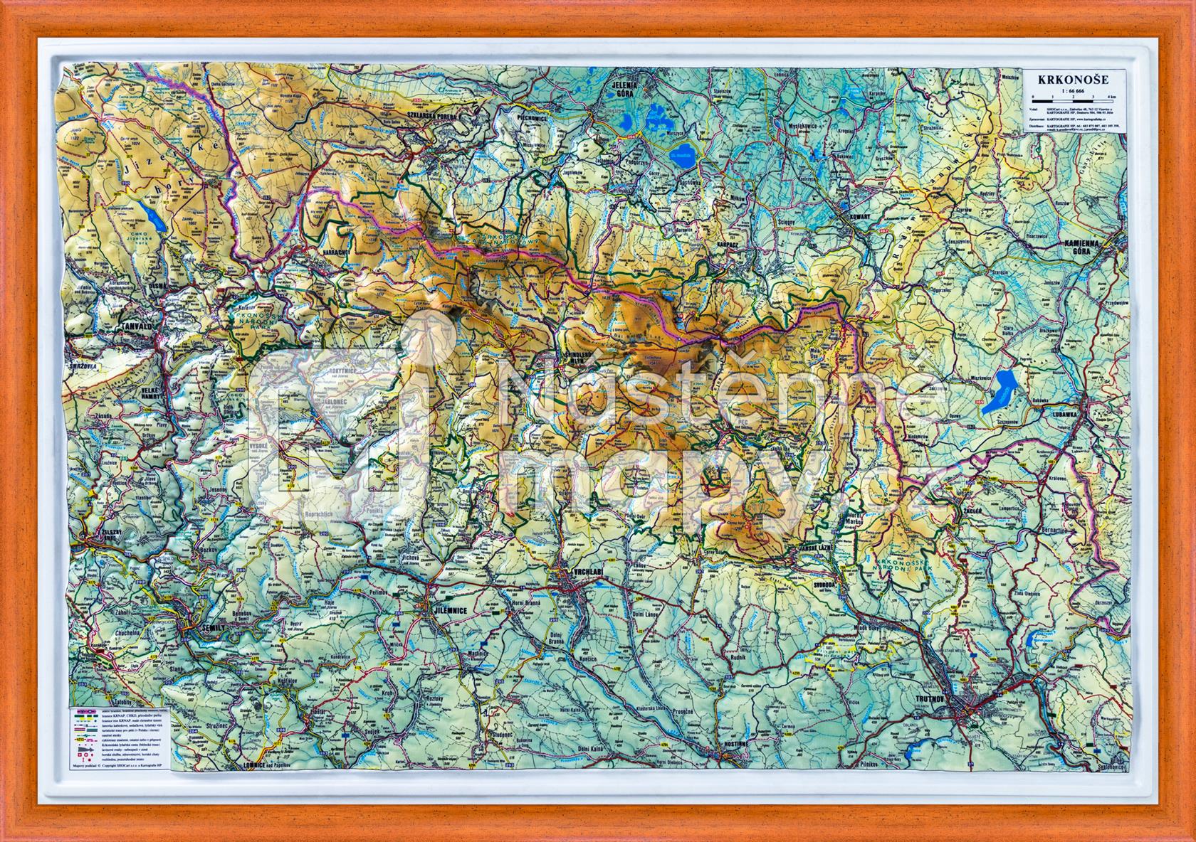 Mapa obsahuje turistické značení, cyklotrasy, Krkonošskou lyžařskou cestu, lavinové svahy, hranice ochrany přírody, rozhledny a jiné zajímavosti. Obecně zeměpisná mapa s turistickým značením a především s efektním plastickým reliéfem pohoří se představuje v novém zpracování za využití digitálního modelu terénu. Použitím speciálních barev je zajištěna odolnost potisku vůči otěru.