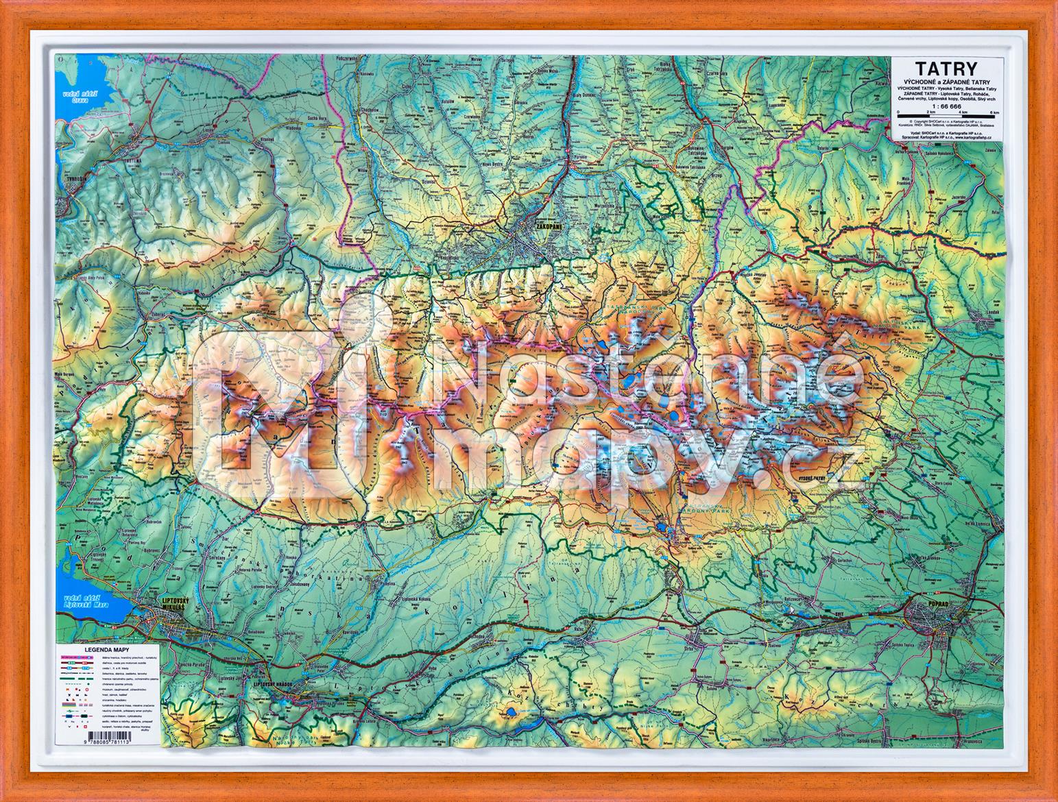 Plastická 3D mapa zobrazuje nejvyšší a nejznámější pohoří našich sousedů – Tatry. Obecně zeměpisná mapa s turistickým značením a především s efektním plastickým reliéfem pohoří se představuje v novém zpracování za využití digitálního modelu terénu. Použitím speciálních barev je zajištěna odolnost potisku vůči otěru.