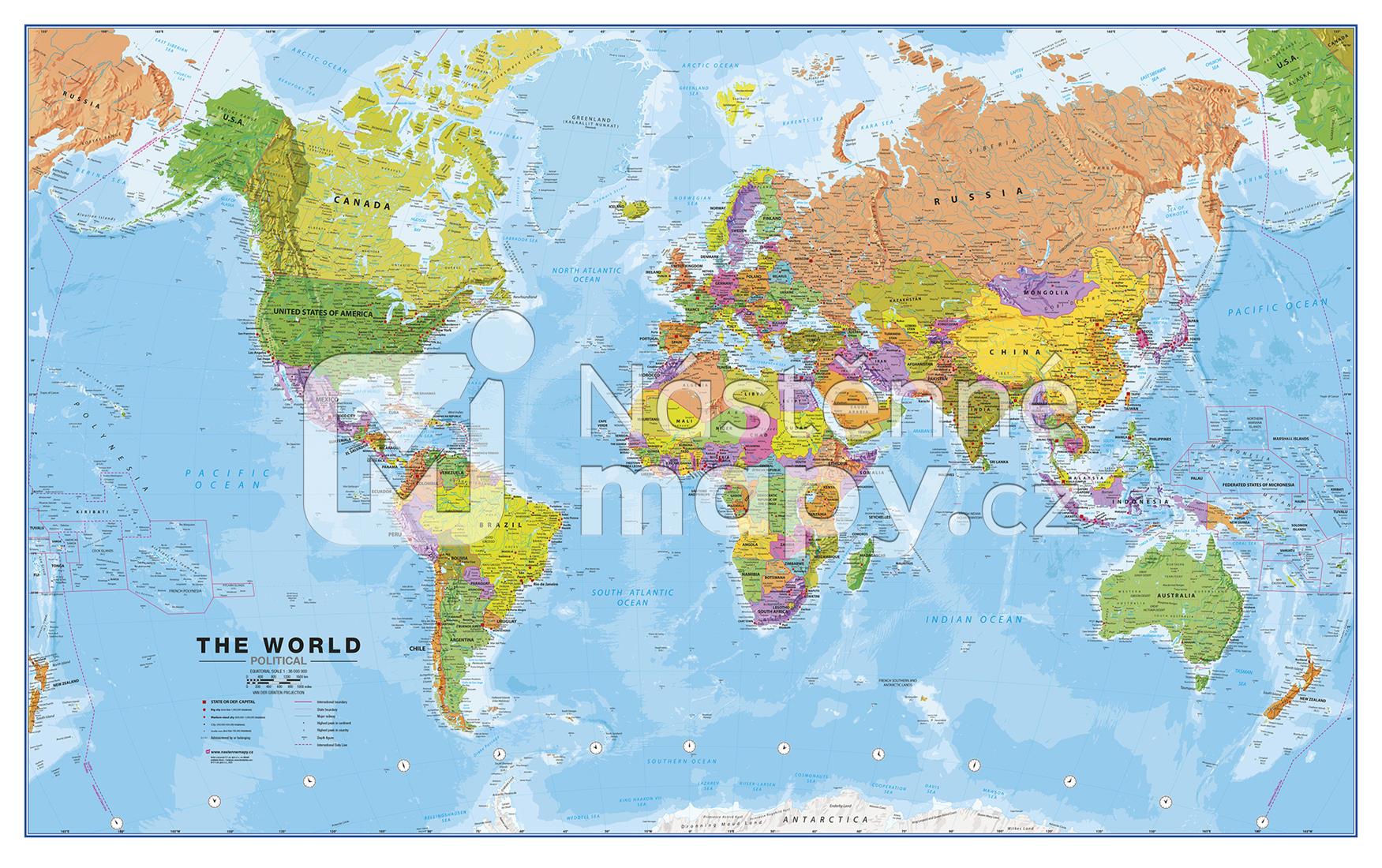 Toužíte změnit vzhled vaší kanceláře, pokoje nebo celé domácnosti? S touto originální mapou se Vám to podaří. Pořiďte si politickou mapu světa, která prozáří celou místnost pastelovými barvami a dá jí moderní vzhled. Tato politická mapa zobrazuje barevně odlišené jednotlivé státy světa, jejich hlavní města a další významná města. Dále řeky, hory, moře a velmi působivé je zejména reliéfní zpracování pohoří. Mapa je velmi podrobná a díky zeměpisným údajům, které obsahuje, může sloužit jako výuková pomůcka dětem a studentům. Tato mapa patří mezi naše bestsellery.
