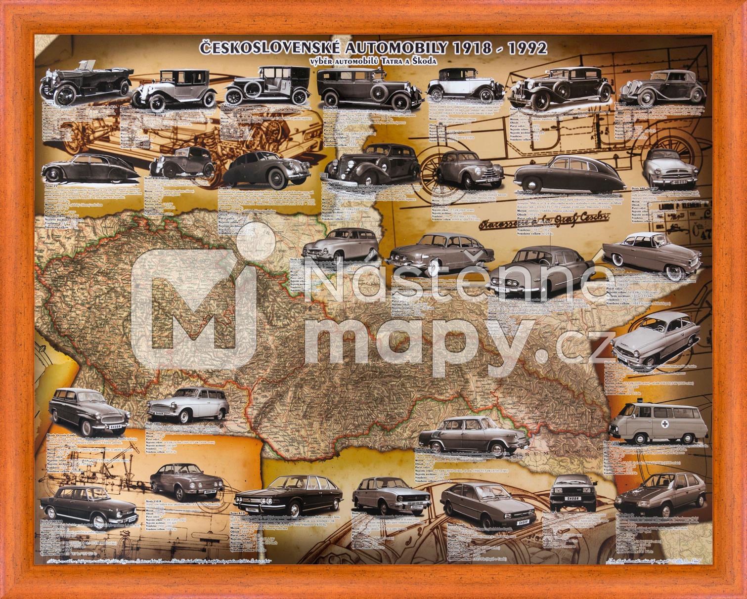 Nástěnný obraz s motivem mapy Československa a vyobrazením vybraných automobilů Tatra a Škoda vyráběných v letech 1918-1992 s doplněním informací o jednotlivých modelech. Mapa je vytištěna na pevném papíře a z obou stran opatřena silným laminem. Lze ji popisovat stíratelným fixem. Je možné objednat také ve variantě podložky na stůl.