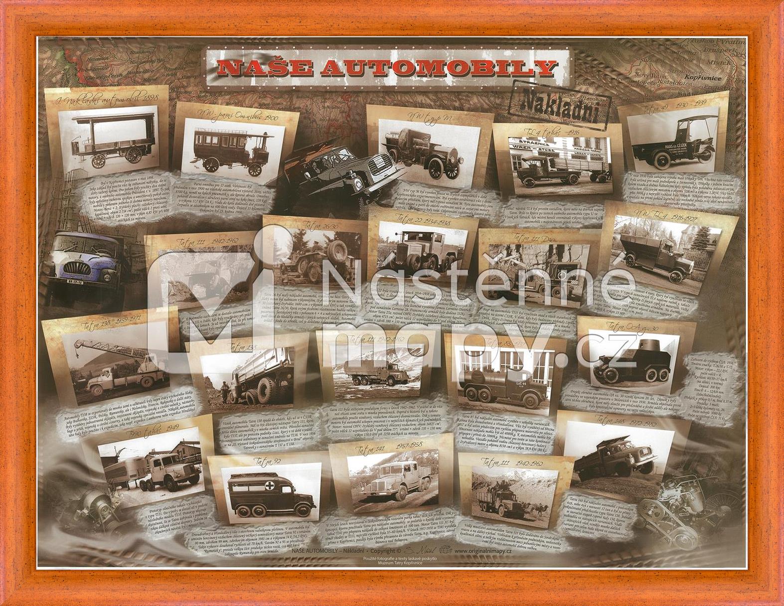 Nástěnný obraz se sérii autentických fotografií nákladních automobilů vyráběných v letech 1898-1982. Kromě řady technických informací o jednotlivých vozech jsou uvedeny také zajímavosti, např. pro koho či k jakému účelu byly určeny nebo které vozidlo zvládlo i jízdu po schodech. Obraz je vytištěn na pevném papíře a z obou stran opatřen silným laminem. Lze popisovat stíratelným fixem. Je možné objednat také ve variantě podložky na stůl.