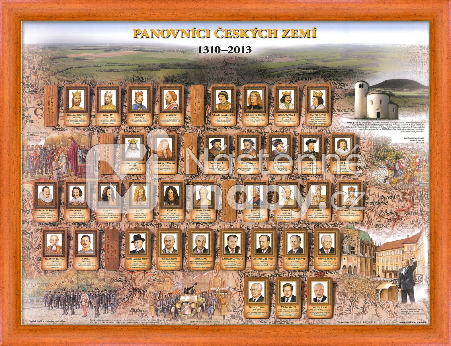 Nástěnný obraz s vyobrazením českých králů a prezidentů v období let 1310-2013 (od Jana Lucemburského po Václava Klause). Doplněno ilustrovanými motivy z českých dějin. Obraz je vytištěn na pevném papíře a z obou stran opatřen silným laminem. Je možné objednat také ve variantě podložky na stůl.