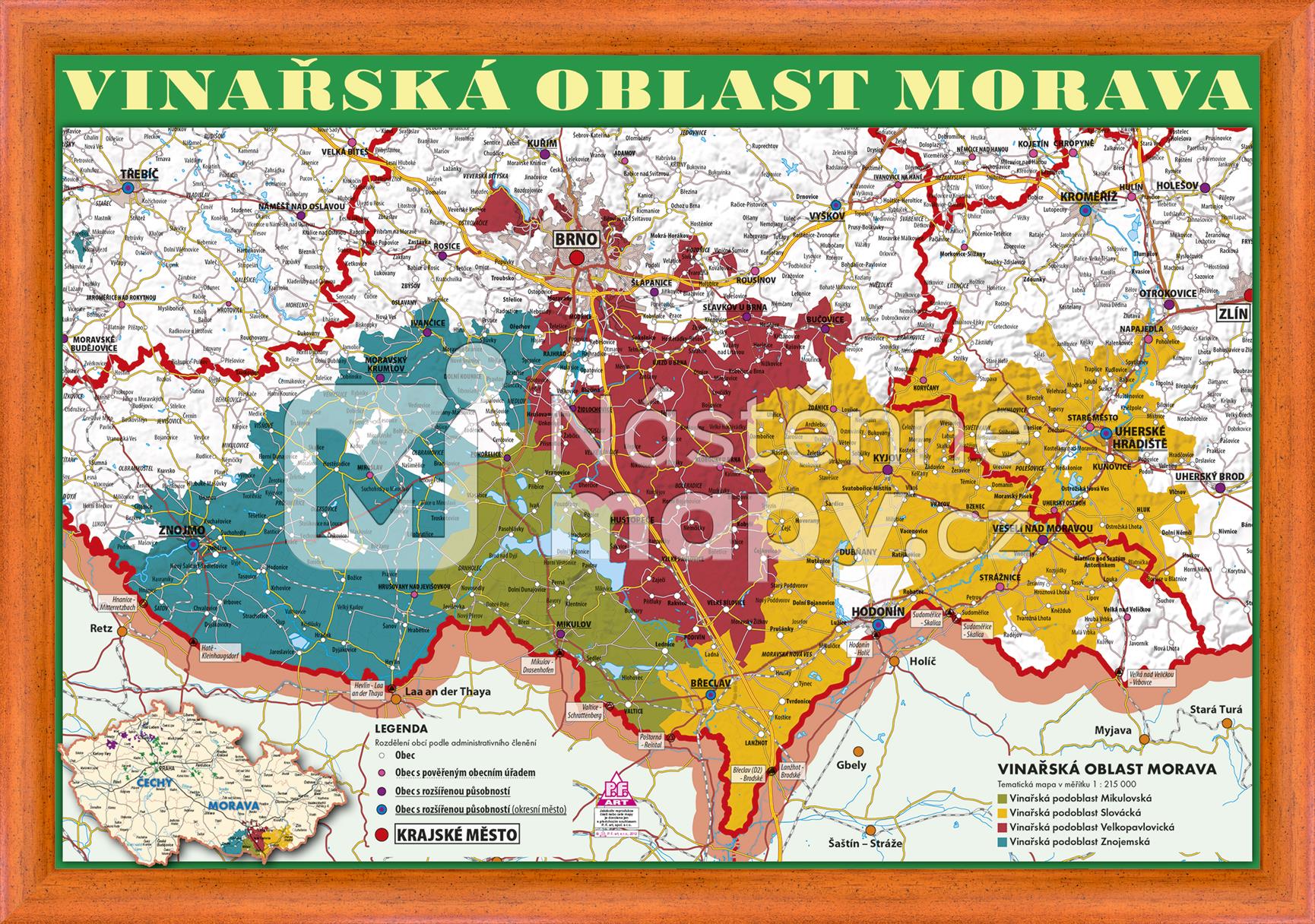 Nástěnný obraz s motivem mapy Moravy rozdělené na jednotlivé vinařské oblasti je vytištěn na pevném papíře a z obou stran opatřen silným laminem. Lze popisovat stíratelným fixem. Je možné objednat také ve variantě podložky na stůl.