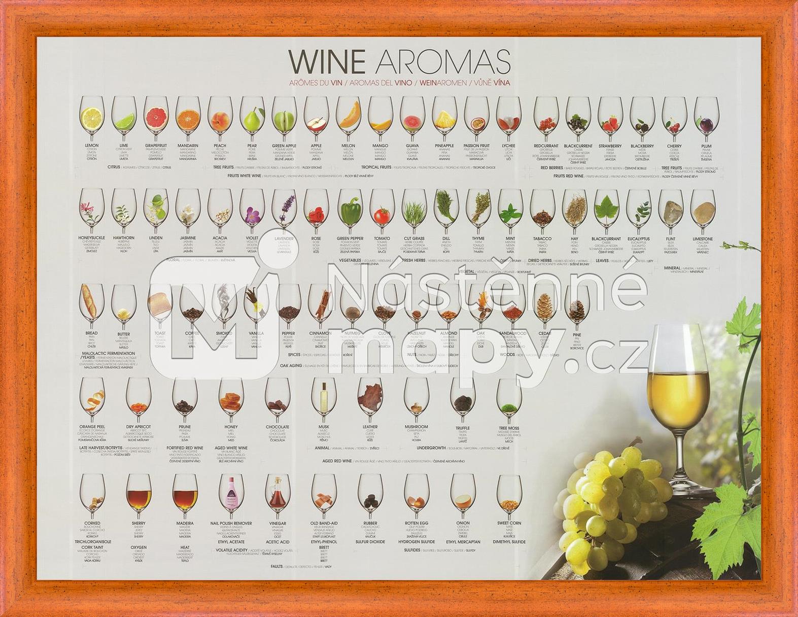 Nástěnný obraz pro orientaci v aromatech, která lze identifikovat ve víně. Typické ovocné, květinové, bylinkové, ale také zcela nečekané tóny vůně. Popisy jsou uvedeny ve čtyřech jazycích. Obraz je vytištěn na pevném papíře a z obou stran opatřen silným laminem. Lze popisovat stíratelným fixem. Je možné objednat také ve variantě podložky na stůl.