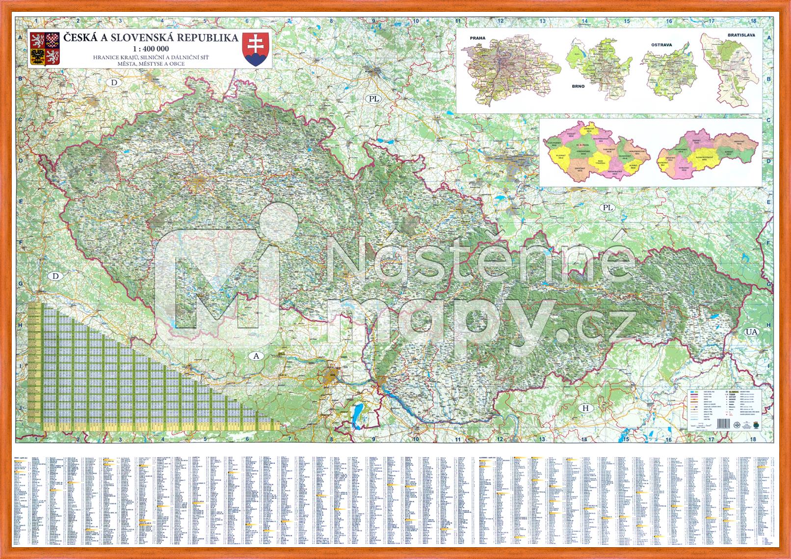 Podrobná automapa ČR + SR r. vydání 2022 - na mapě jsou i obce pod 150 obyvatel, stínovaný reliéf hor, s kilometrovníkem. Jediná mapa na trhu, na které jsou vyznačeny i silnice 3. třídy, dále také zobrazení hranic jednotlivých krajů. Rejstřík obcí nad 1000 obyvatel. Rozměr mapy 199 x 138 cm, měřítko 1 : 400 000.
