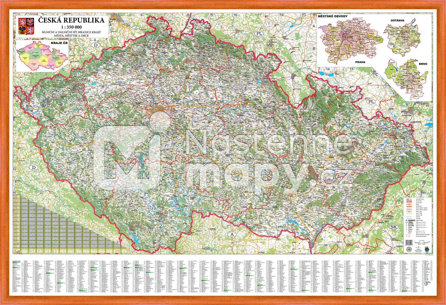 Mapa České republiky silniční v měřítku 1 : 350 000; na mapě je vyznačena silniční síť včetně silnic 3. třídy, vyznačeny jsou hranice jednotlivých krajů, součástí je i mapka krajů a městských obvodů Prahy, Brna a Ostravy, v rohu mapy kilometrovník vzájemných vzdáleností mezi 70 největšími městy a v dolní části je uveden rejstřík obcí.
