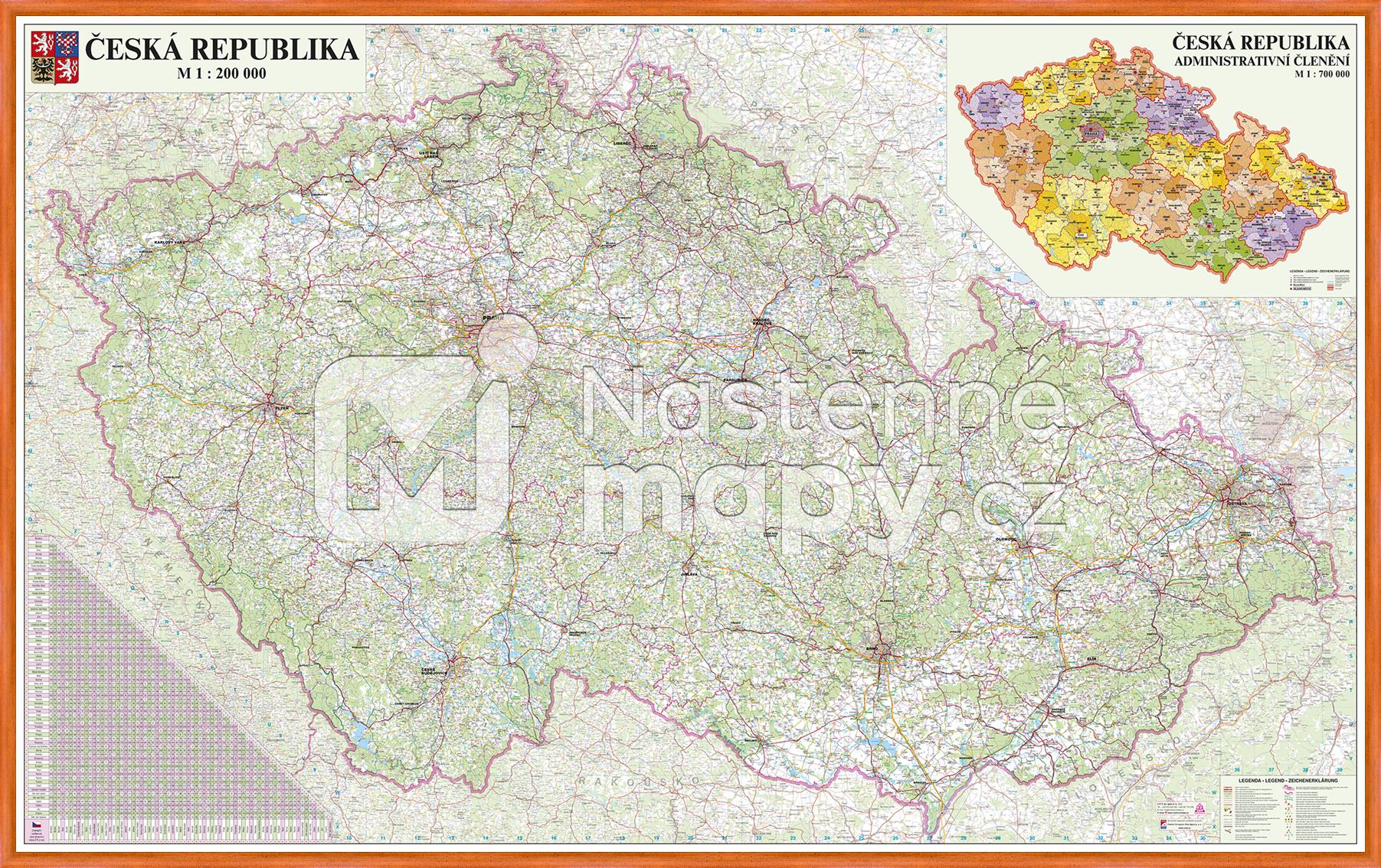 Nejpodrobnější silniční mapa ČR na trhu. Zobrazuje všechny obce i části obcí, silniční síť včetně silnic 3. třídy a zaznačení dálničních exitů s názvem a kilometráží, názvy pohoří a hranice jednotlivých krajů i okresů. Mapa je doplněna kilometrovníkem okresních měst a přehledovou mapou ČR s administrativím člněněním. Rozměr mapy 2,4 x 1,5 m, měřítko 1 : 200 000. Na mapě jsou dále zaznačeny dálnice a silnice ve výstavbě, plánované silnice, chráněnné krajinné oblasti a řada zájmových bodů. Mapa je jedinečná také zobrazením podrobných nformací i za hranicemi ČR. Rejstřík obsahující přes 16000 obcí a částí obcí ke stažení zde.